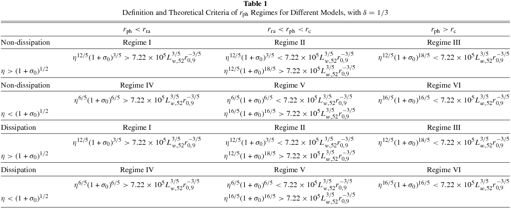 For different central engine parameters, Γra can have two possible values: η or [η(1 + σ0)]1/3. For each case, the photosphere radius rph can be in three different regimes separated by rra and rc. So altogether we can define six different regimes: (I) η > (1 + σ0)1/2 and rph < rra; (II) η > (1 + σ0)1/2 and rra < rph < rc; (III) η > (1 + σ0)1/2 and rph > rc; (IV) η < (1 + σ0)1/2 and rph < rra; (V) η < (1 + σ0)1/2 and rra < rph < rc; (VI) η < (1 + σ0)1/2 and rph > rc. The six regimes also apply for the case with significant magnetic dissipation below the photosphere (see below). In Table 1, we list the criteria of all 12 regimes (for the cases of both without and with magnetic dissipations) based on the central engine properties. In the following, we derive relevant parameters in each regime, including rra and rc (which are useful to write down the Γ evolution of the system), along with the photosphere properties, i.e., rph, Γph, (1 + σph), kTob, and FBB: