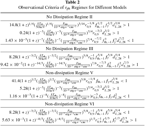We again consider the six regimes for the non-dissipative photosphere studied in Section 3.1. Similar to Pe'er et al. (2007), Regimes I and IV (rph < rra) introduce an additional degeneracy, so that central engine parameters cannot be inferred. We therefore focus on the other four regimes. The criteria for the four regimes based on observations are summarized in Table 2.
