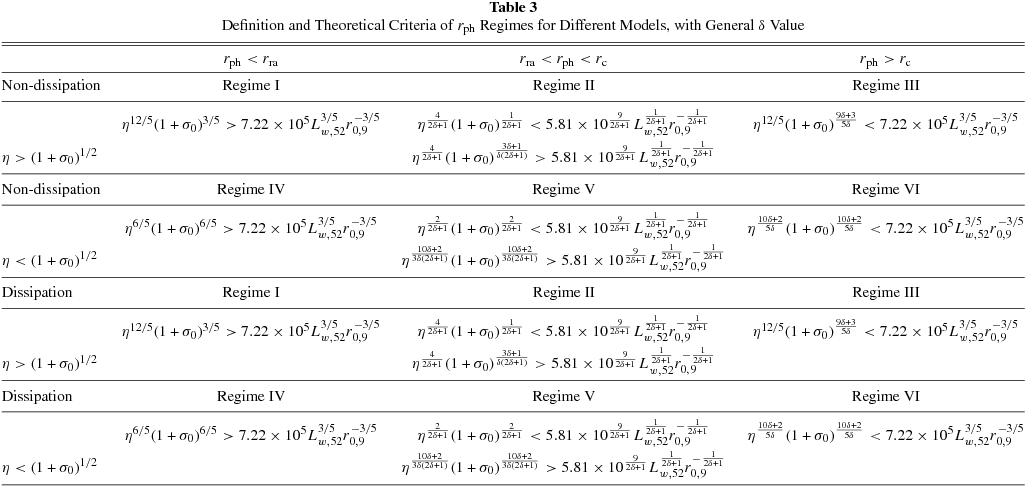 For the general δ models, the criteria of all 12 regimes based on the central engine properties are collected in Table 3.