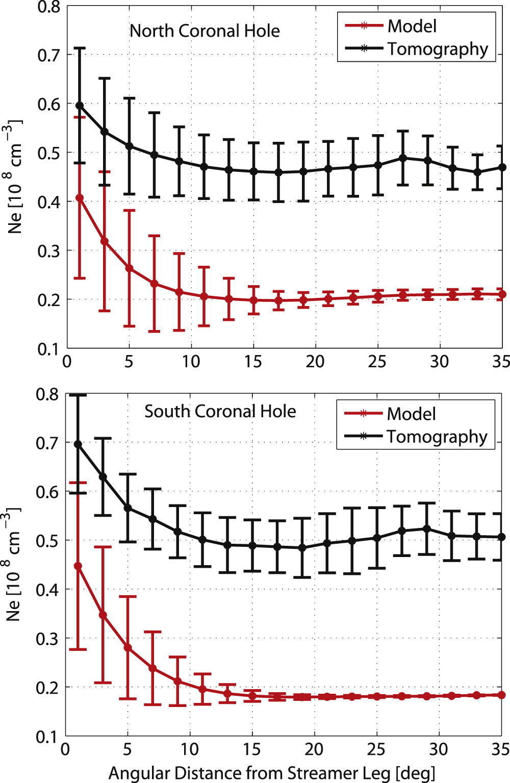Figure 14. Electron density vs. angular distance in the north (top) and south (bottom) coronal holes for CR2063, extracted from the model and tomography density maps at r = 1.075 R