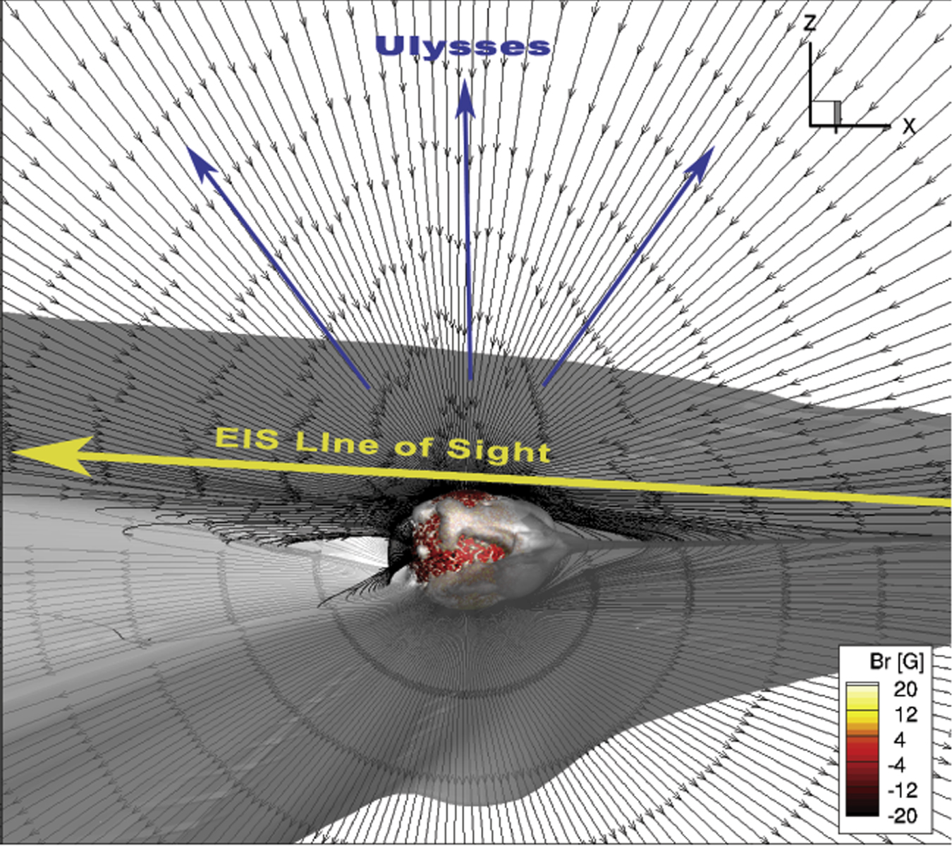 The geometry is shown schematically in Figure 1. The black curves are magnetic field lines, while the solar surface is colored by the radial magnetic field and the gray surface represents the location of the current sheet. The direction of the EIS LOS is shown by the yellow arrow. The blue arrows represent the general direction of Ulysses polar pass, although the details of the trajectory itself are not represented in this figure. Note that only the open field lines were used to obtain a solution from MIC, and closed field lines are shown here for clarity.