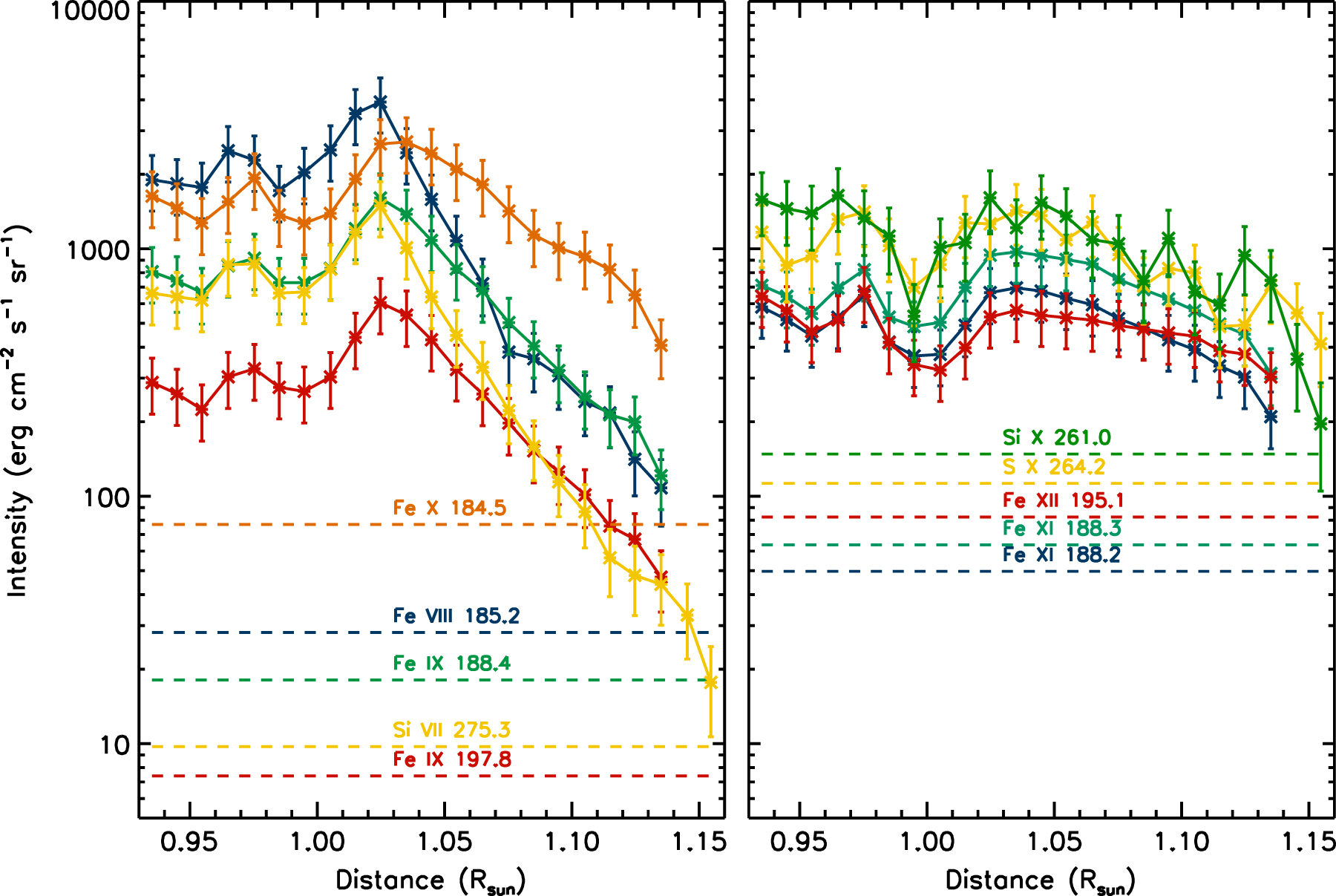 Standard image High-resolution imageFigure 10. Observed and synthetic LOS flux vs. radial distance for emission lines from Si vii and Si x. The color-coding is similar to Figure 8.
