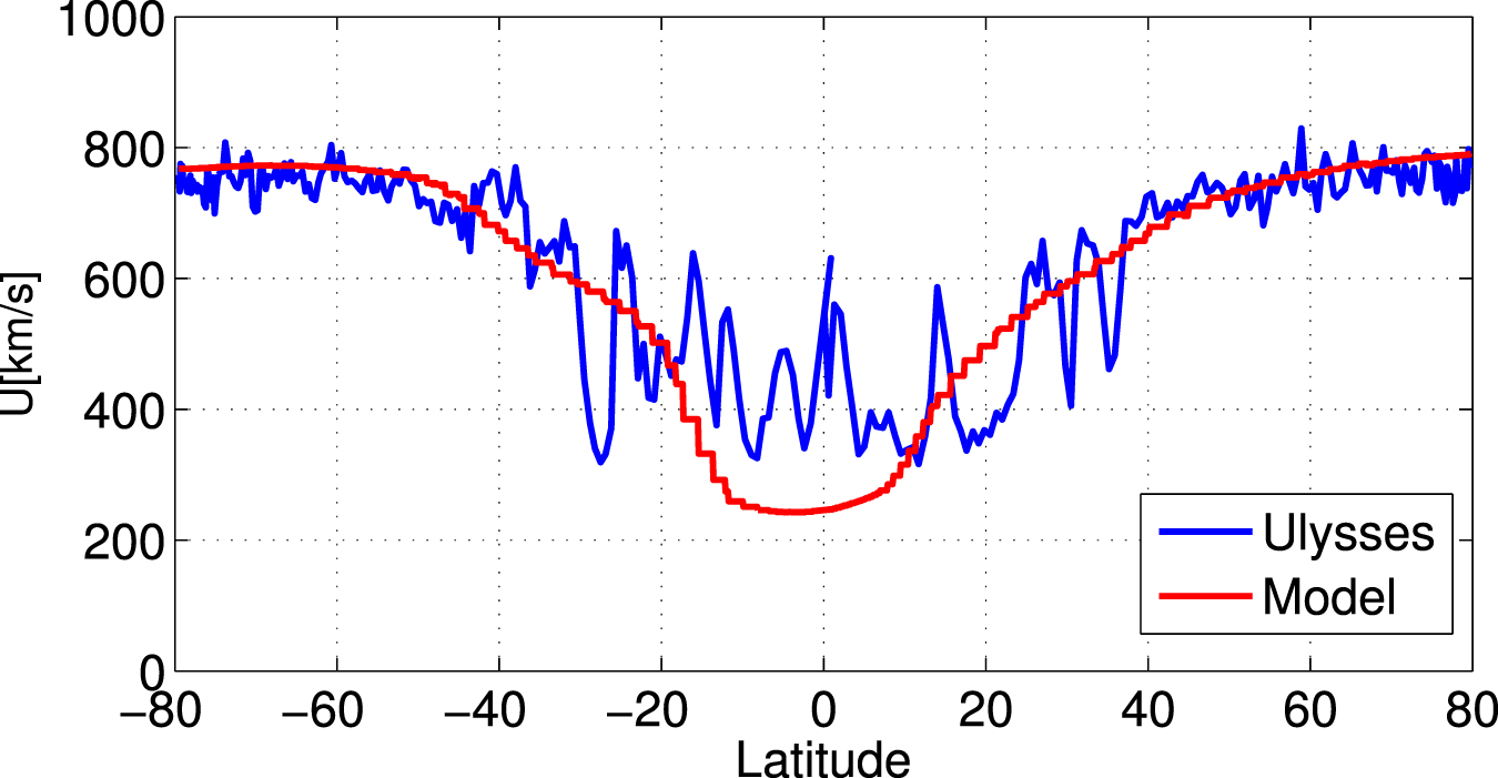 - 2.For comparison with Ulysses observations, the MIC solution is obtained for field lines that reach the same meridional plane at 1.8 AU, at all latitudes at 1° spacings. Since AWSoM is driven by a synoptic magnetogram, changes in the solar magnetic field during Ulysses's year-long polar scan are not simulated. The comparison should be regarded as a qualitative examination of how well the model reproduces the large-scale structure of the frozen-in charge states during solar minimum. In this case tracking the solution along the field lines reaching the exact Ulysses trajectory is not needed, and it suffices to cover all latitudes.