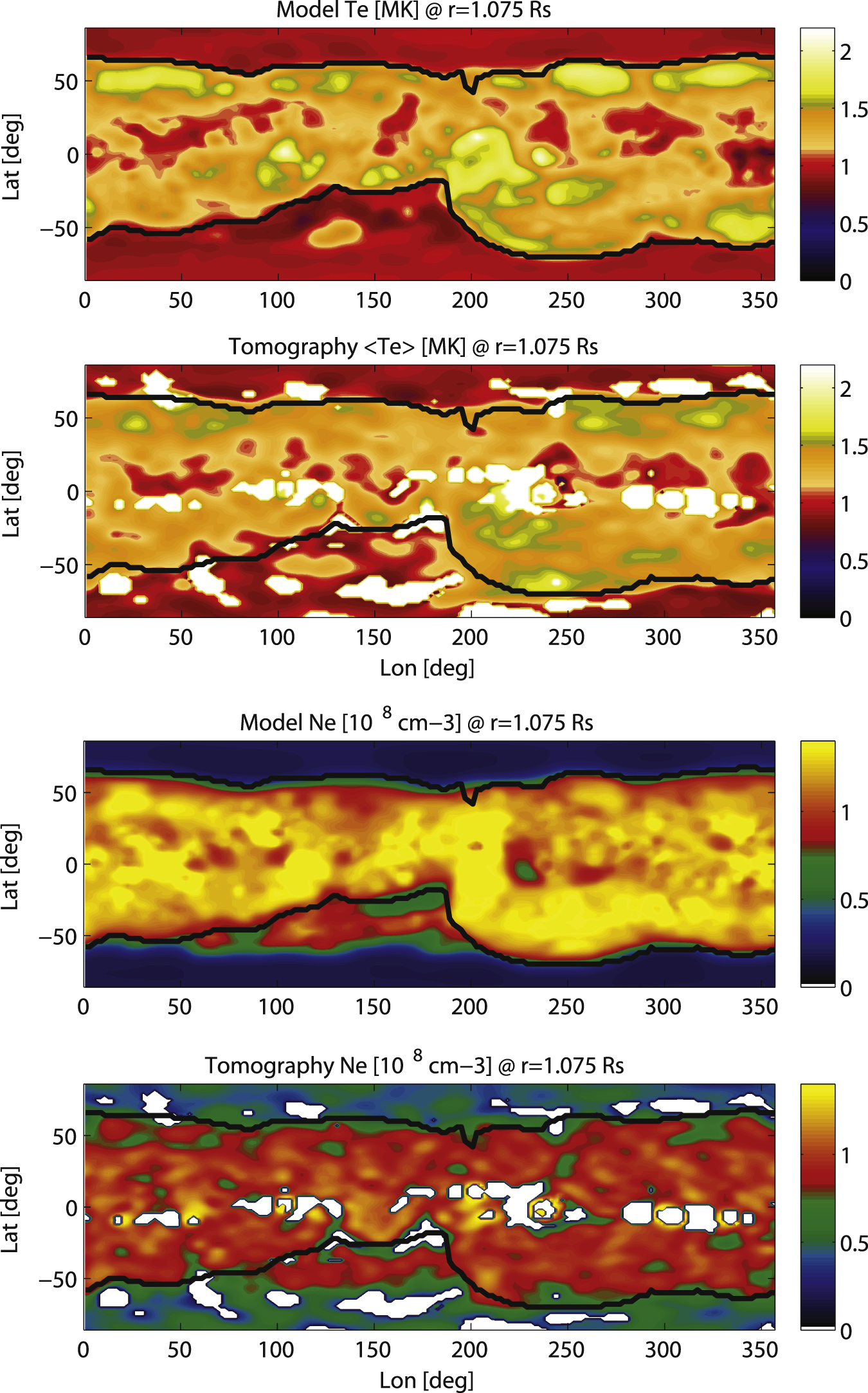 Standard image High-resolution imageIn the previous section, we showed that an electron density and temperature enhancement in the CHB region in the lower corona is responsible for the increased charge states in the wind coming from this region. The analysis of the tomographic data confirms that such an enhancement is present on the Sun, and that this behavior is characteristic of the entire CHB region at all longitudes. It also shows that even though the model underpredicts the absolute values in the CHB, it does correctly predict the variation with latitude of these quantities inside the CHB region.