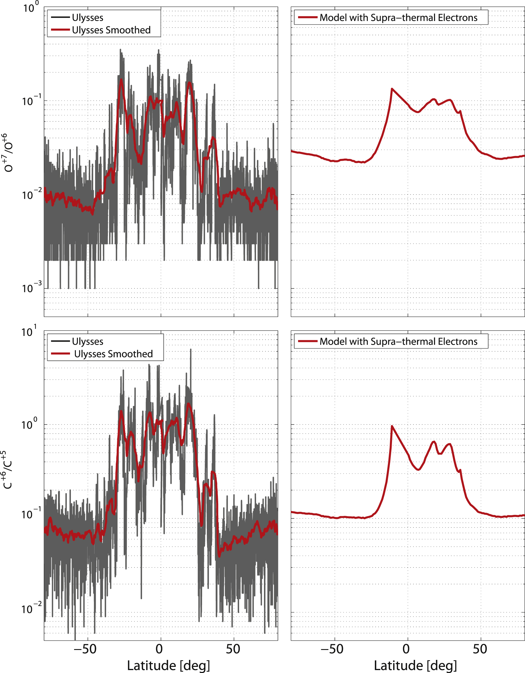 measured by Ulysses/SWICS at 3 hr resolution versus latitude. The blue curve shows a moving average over a 6 day window, while the red curve shows the modeled frozen-in values, for the case including supra-thermal electrons. The model results for the case of a single-temperature electron population give only slightly smaller values at these heights (around 0.1–0.2 lower than the supra-thermal case). It can be seen that the modeled