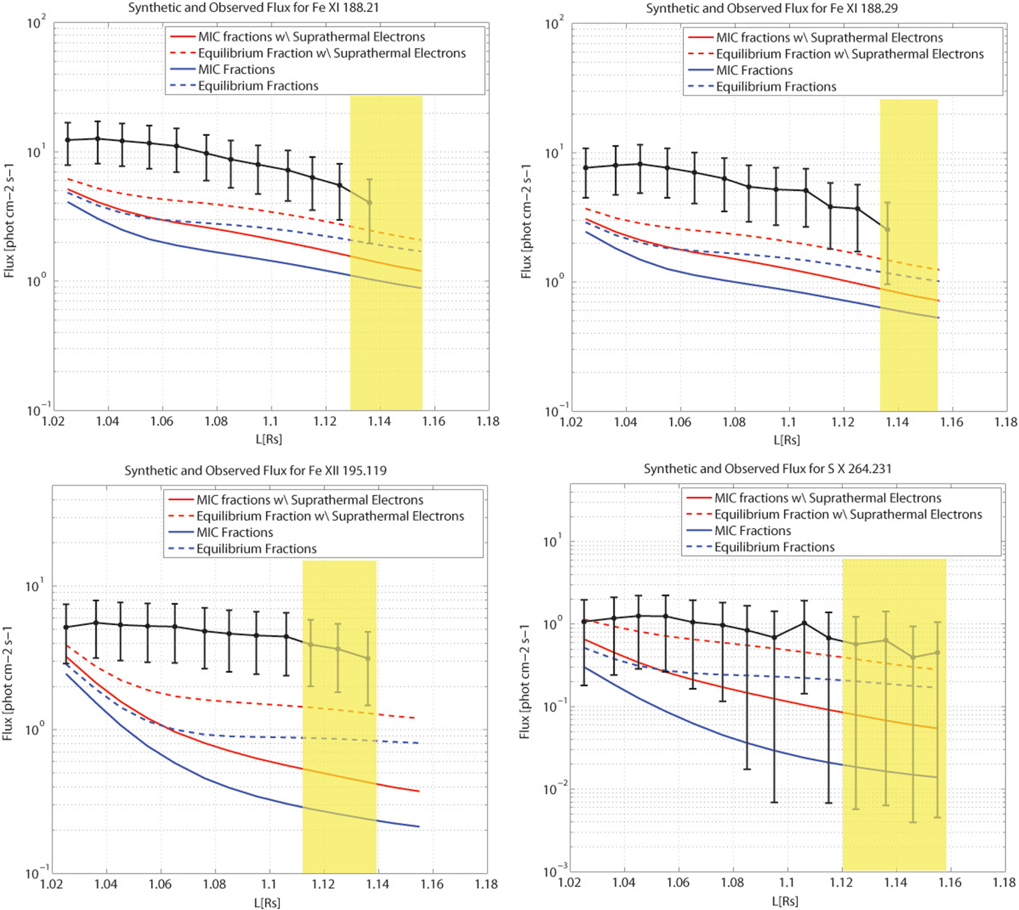 Figures 8–10 show the comparison of the synthetic and EIS fluxes as a function of height for all the lines. In each figure, the black curve shows the EIS observations and their uncertainties. The two blue curves show the synthetic flux for a single-temperature electron population, while two red curves are for the supra-thermal case. Within each pair, the solid curve is based on MIC ion fraction, while the dashed curve is based on ionization equilibrium fractions. The height ranges shaded in yellow represent the distances at which scattered light contamination may be higher than 20% of the observed flux, taken from Table 1.