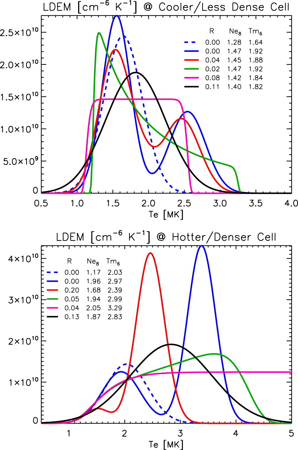 Figure 12. All LDEM models for two sample cells of the magnetically closed corona, one belonging to a hotter and denser region than the other. Inversion of AIA-3: G1 (dashed-blue). Inversion of four bands: G2 (solid-blue), G4 (red), ATH (green), TH (pink), and G1 (black). The values of R, Ne, and Tm for each model is shown in the top region of the figure.