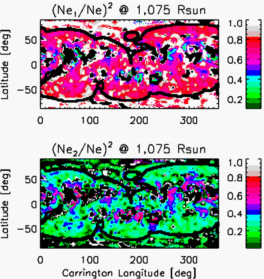 For the analysis shown in this section we chose 1.075 ${R}_{\odot }$ as an intermediate sample height. Similar results were found at all tomographic heights. We investigated the dependence with height of both ${N}_{{\rm{e}},2}(r)$ and ${N}_{{\rm{e}},1}(r)$ within the quiet region of the streamer belt, similar to Vásquez et al. (2011). The scale heights of both quantities differ by only about 12%, so that the ratio of squared densities ${\left({N}_{{\rm{e}},2}/{N}_{{\rm{e}},1}\right)}^{2}$ is roughly constant with height, showing a variability of less than 10% over the range 1.025 to 1.20 ${R}_{\odot }.$