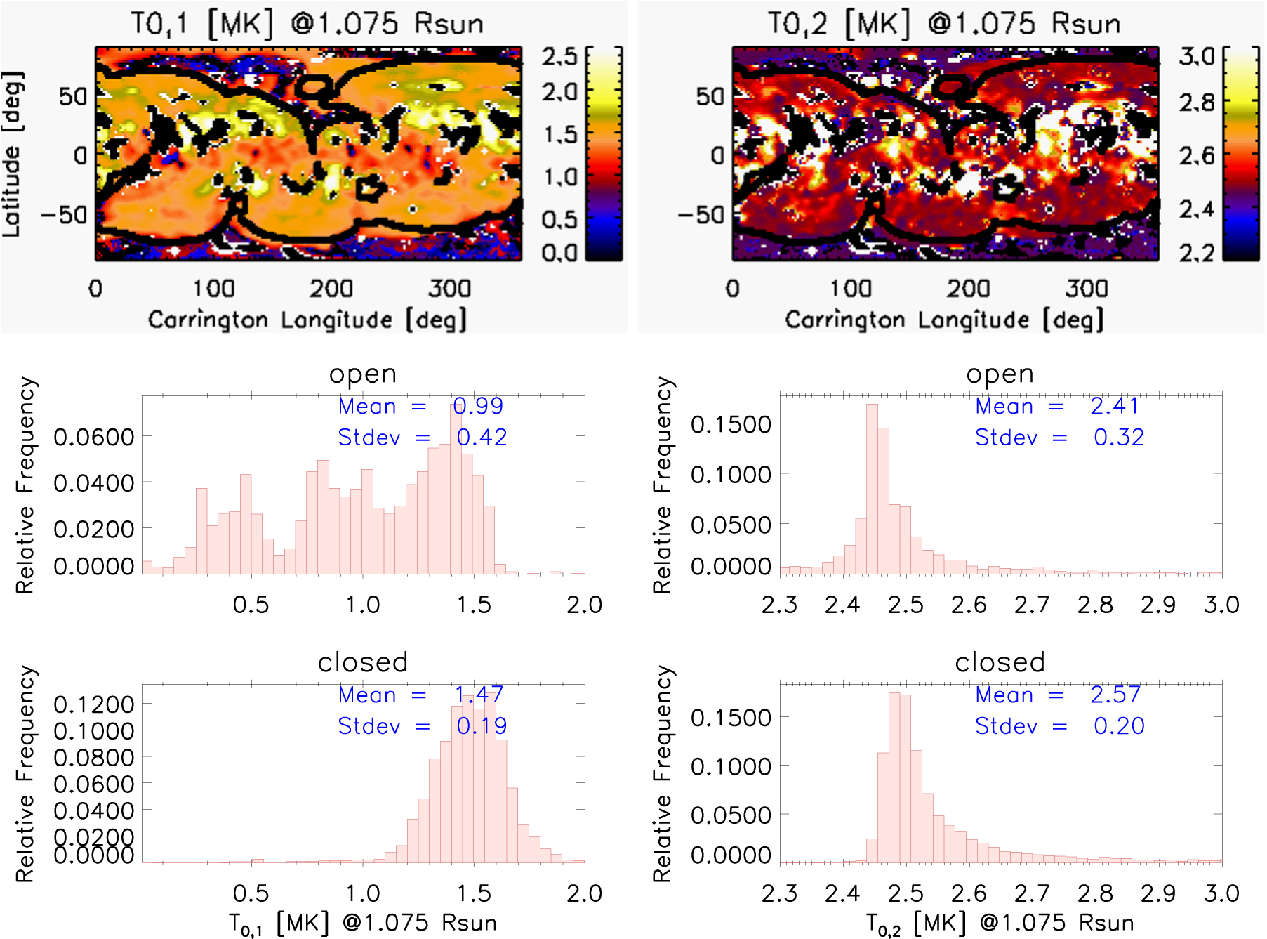 Figure 16. Top panels: Carrington maps at 1.075 ${R}_{\odot }$ of the centroids of the first (${T}_{\mathrm{0,1}}$) and the second normal distribution (${T}_{\mathrm{0,2}}$). Center and bottom panels: histograms of the centroids shown in the top panels in the open and closed magnetic region, respectively.