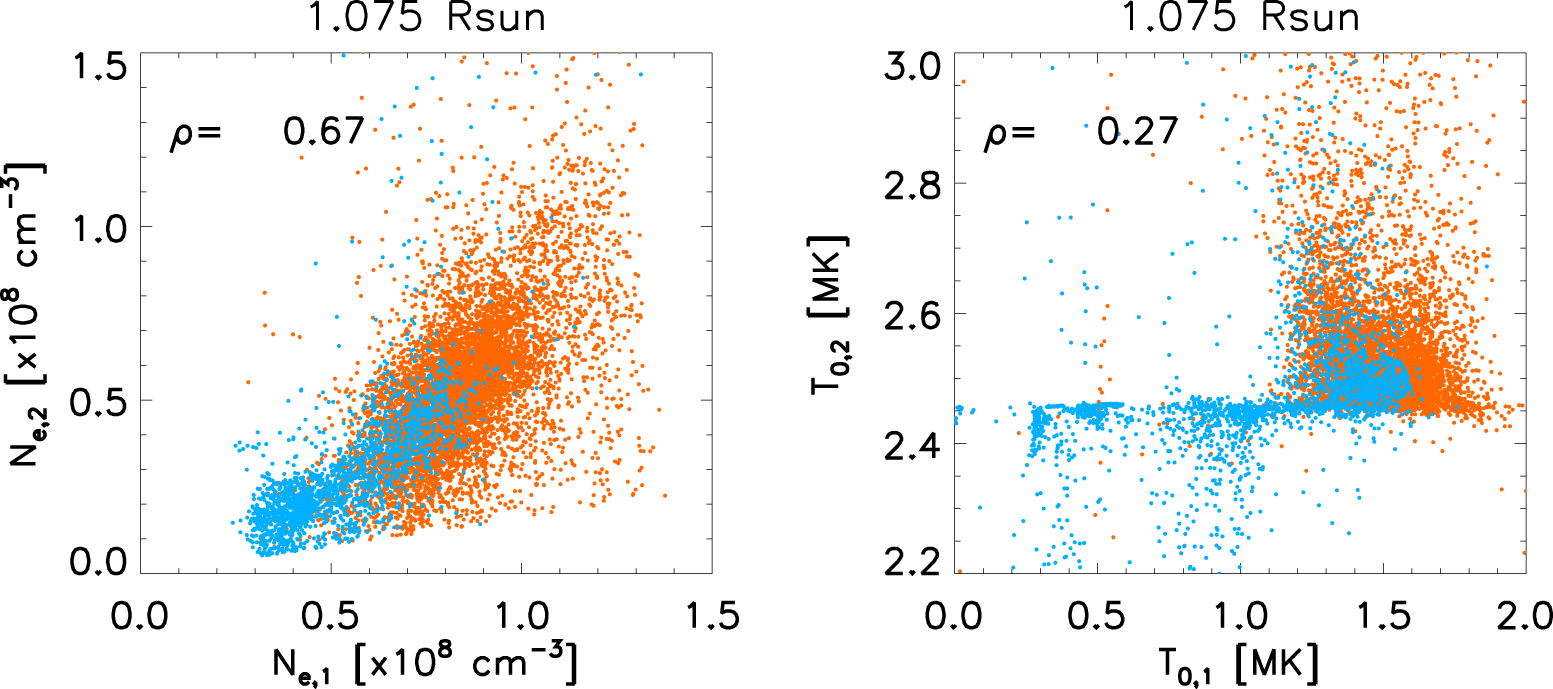 Figure 17. Left: scatter plot of ${N}_{{\rm{e}},1}$ vs. ${N}_{{\rm{e}},2}$ at 1.075 ${R}_{\odot }.$ Right: scatter plot of ${T}_{\mathrm{0,1}}$ vs. ${T}_{\mathrm{0,2}}$ at 1.075 ${R}_{\odot }.$ In both panels, the blue dots corresponds to voxels in the open region and the orange dots correspond to voxels in the closed region. In each panel the Pearson correlation coefficient ρ between both plotted quantities is indicated.