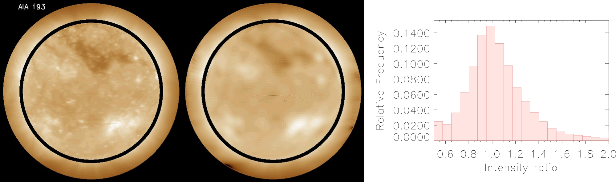Figure 1. Left panel: image taken by the 193 Å band of the AIA instrument (left), and corresponding synthetic image computed by LOS integration of the tomographic FBE (right). Right panel: frequency histogram of the synthetic to observed intensity ratio for every corresponding pair of pixels in the two images.
