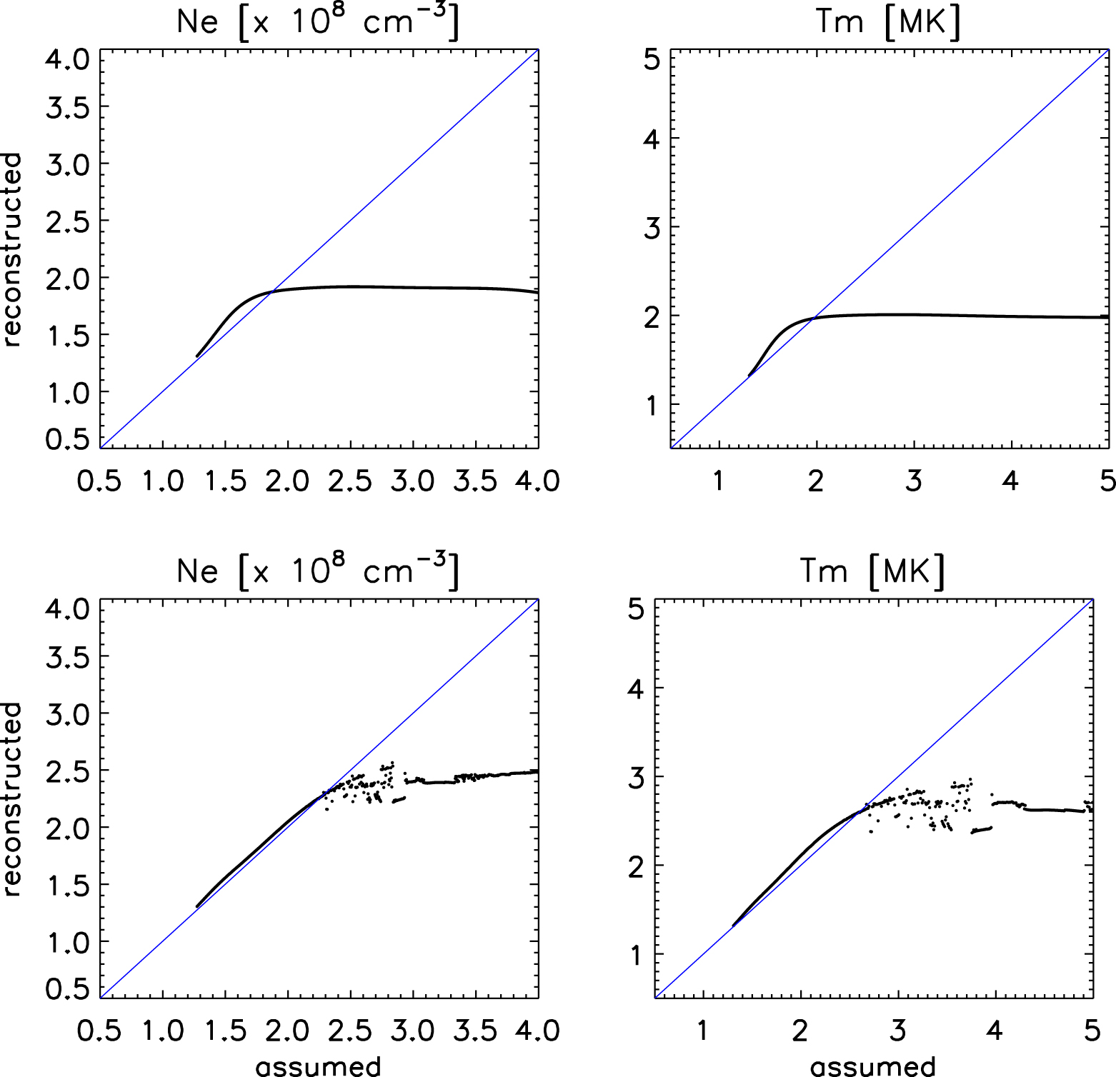 Figure 3. Scatter plots (black dots) of the assumed LDEM moments vs. the reconstructed LDEM moments for AIA-3/G1 (first row) and AIA-4/G2 (second row). The identity line is overplotted in blue.