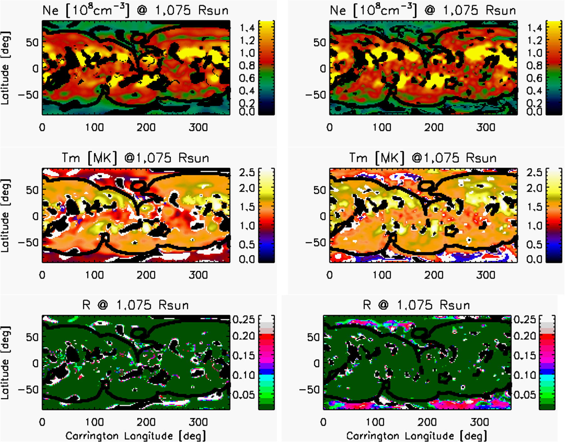 Figure 8. CR-2099. Carrington maps of Ne, Tm, and R at 1.075 ${R}_{\odot }$ using data of AIA-4/G2(left) and AIA-4/G4 (right). The boundary between the magnetically open and closed region is overploted as a thick black curves in all maps. ZDAs and AEVs are marked in the same way as in Figure 4.