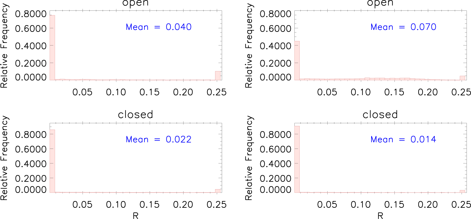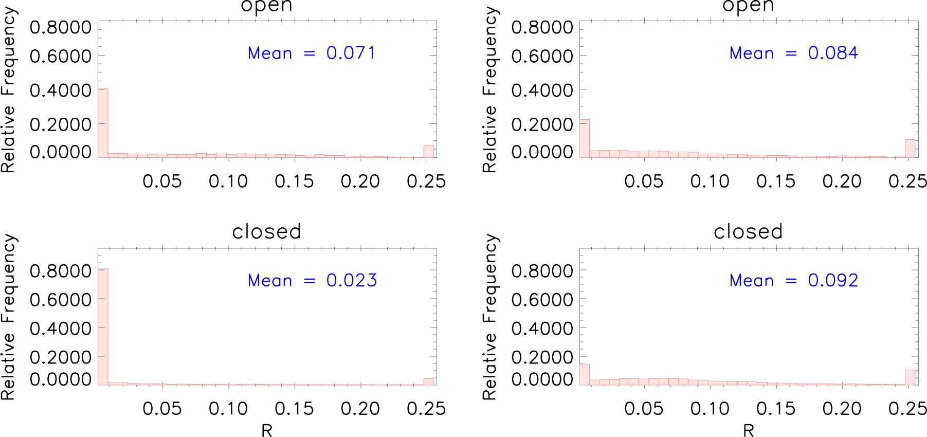 Figure 9. Histograms of R at 1.075 ${R}_{\odot }$ in the open region (top panels) and in the closed region (bottom panels) using AIA-4/G2 (left) and AIA-4/G4 (right).