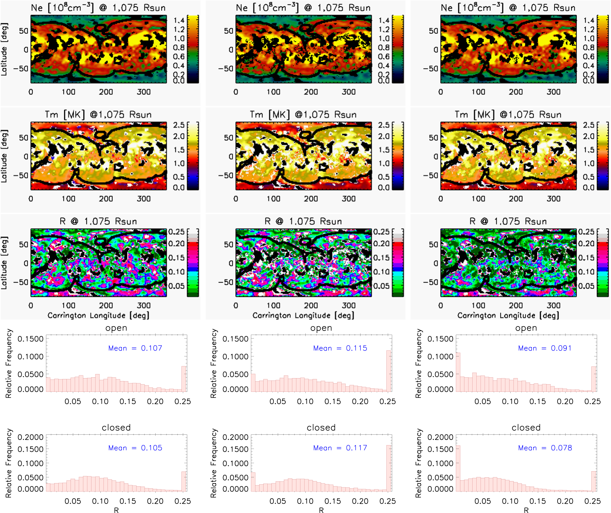 First, the LDEM is modeled with the G1 parametrization. The results are displayed in the left column of Figure 7 which shows, from top to bottom, the Carrington maps of Ne, Tm, and R at 1.075 ${R}_{\odot },$ and the frequency histograms of the R values at the same height, separated in the open and closed region. A comparison of the results for R in this column against those in the right column of Figure 4, and also those in Figure 5, shows that the G1 model cannot explain the emisivity in the four bands as succesfully as it does for the three bands. It is the shape of the G1 model and the fact that it depends on only three parameters that makes it unsuccessful in coping with the wider temperature sensitivity range of the AIA-4 data set.