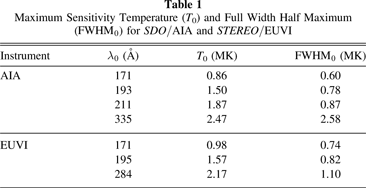 Table 1.  Maximum Sensitivity Temperature (T0) and Full Width Half Maximum (${\mathrm{FWHM}}_{0}$) for SDO/AIA and STEREO/EUVI