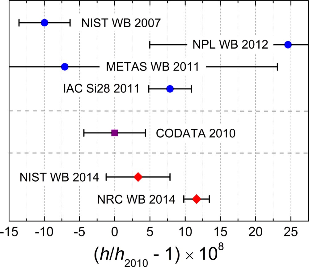Figure 1. Results of determinations of the Planck constant expressed with respect to the 2010 CODATA value (h2010). The points with filled blue circles were taken into account by CODATA in 2010 and those indicated by filled red diamonds are more recent. The bars indicate standard uncertainties.
