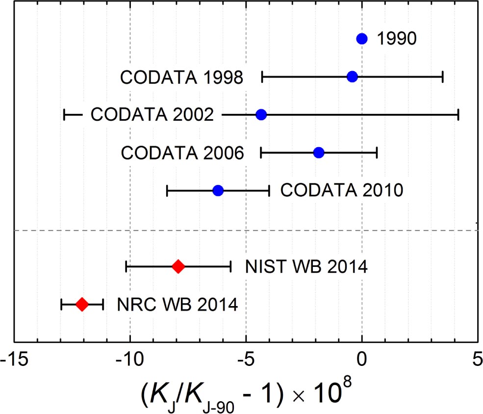 Figure 2. Values of the Josephson constant in terms of the conventional 1990 value (KJ-90) derived from different experimental determinations of the Planck constant. The points with filled blue circles are the results of CODATA determinations of the fundamental constants. Those indicated by filled red diamonds are values of the Josephson constant determined from the results of particular determinations of the Planck constant. The bars indicate standard uncertainties.