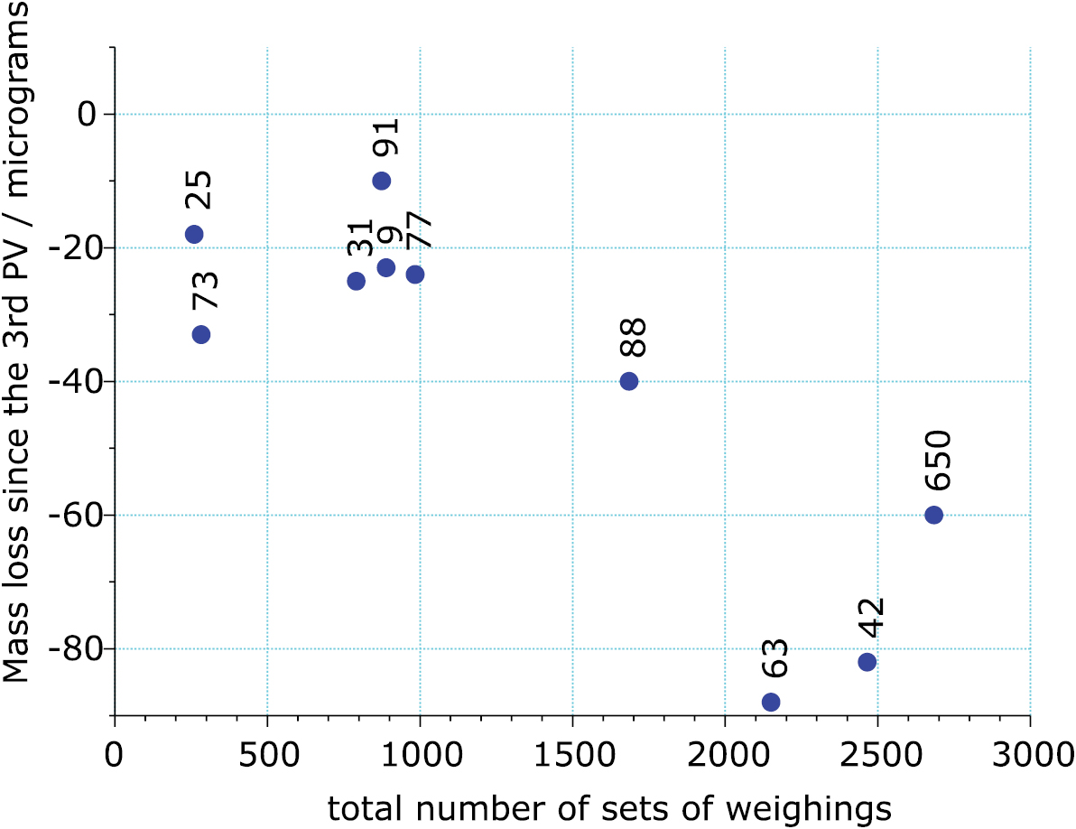 Figure 1. Total mass loss measured for the BIPM working standards between 1992 and 2014 as a function of the number of weighings performed with each of them. The labels designate the working standard concerned. A set of weighings comprises 10–19 loadings of a working standard (depending on the mass comparator used). Note that the use of prototypes 88 and 91 only started in 2003.