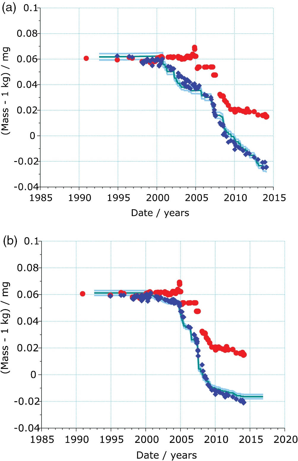 Figure 5. Evolution of the measured mass of working standard no. 42', according to models 3 and 3b, figures (a) and (b) respectively. This mass standard had not been cleaned and washed during the period considered here. The red points are the mass assignments made by the BIPM at the time. The blue diamonds are the mass assignments made at present by each model where an additional step in the fitting procedure was added to force the data to respect the experimental mass differences. The central green line is the curve fitted by each model. The surrounding light blue lines are the standard uncertainty of the fit.