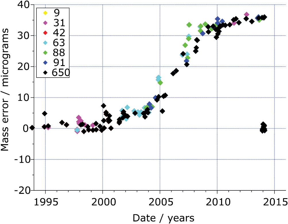 Standard image High-resolution imageDuring the years 1993–2014 all the BIPM working standards were frequently inter-compared. Therefore, the mass offset (the difference between the assumed mass of the standard and its mass with respect to the IPK, respectively the red dots and the blue diamonds of the figures above) experienced by a particular working standard propagated rapidly to the rest of the working standards. This implies that during this period, calibrations of national prototypes were affected by a mass offset which depended on the date of the calibration but not on the particular working standards used as references in the calibration.