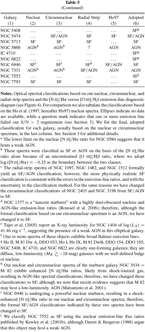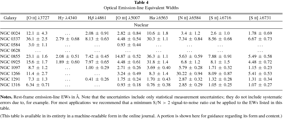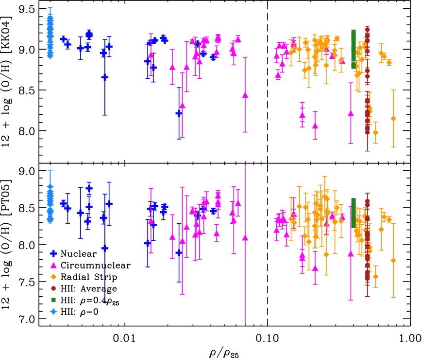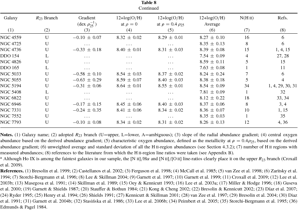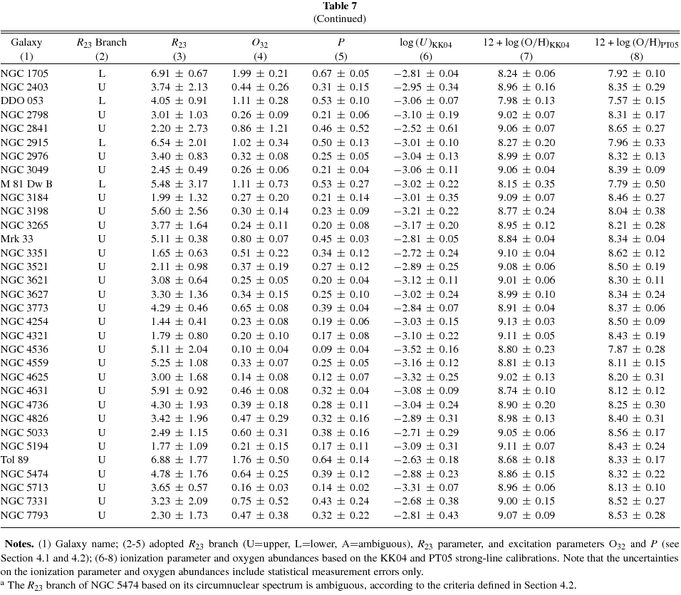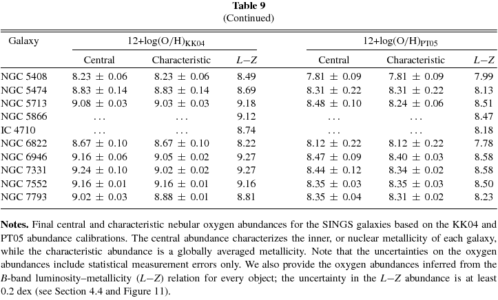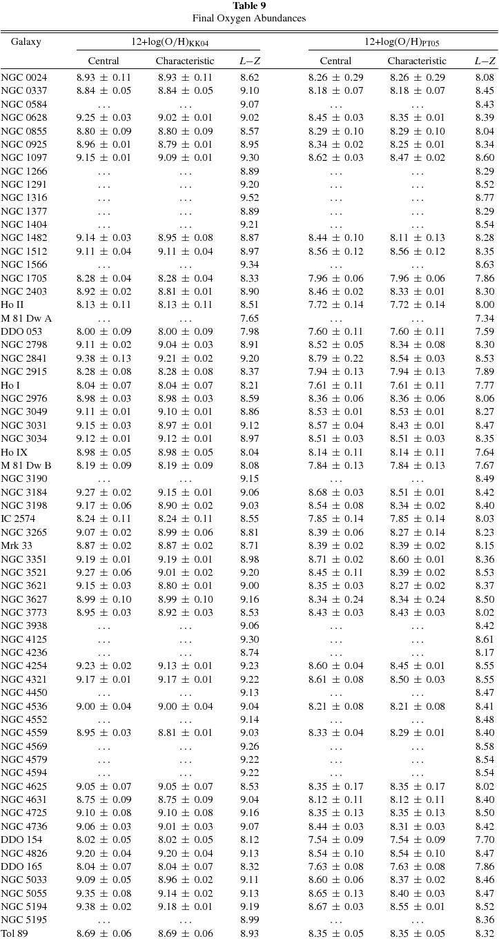 Summarizing, Table 9 contains central and characteristic abundances for 55 galaxies, or ∼73% of the SINGS sample. The characteristic abundances range from 12 + log (O/H)KK04 = 8.00–9.21 based on the KK04 calibration, or 12 + log (O/H)PT05 = 7.54–8.60 using the PT05 calibration. Among the 20 objects with no metallicity estimate, 16 (80%) are early-type, bulge-dominated galaxies lacking prominent emission lines in their integrated spectrum (e.g., NGC 0584, NGC 5866), or their optical emission-line spectrum is dominated by the central AGN (e.g., NGC 1266, NGC 4579). Unfortunately, H ii regions either are not present in these galaxies, or have not been observed. The remaining four objects are late-type galaxies (e.g., NGC 3938), including three dwarfs (M 81 Dw A, NGC 4236, and IC 4710), for which we were unable to obtain a useful optical spectrum (see Section 2.2.1), and for which no H ii regions have been observed in these objects based on our search of the literature (see Appendix B).