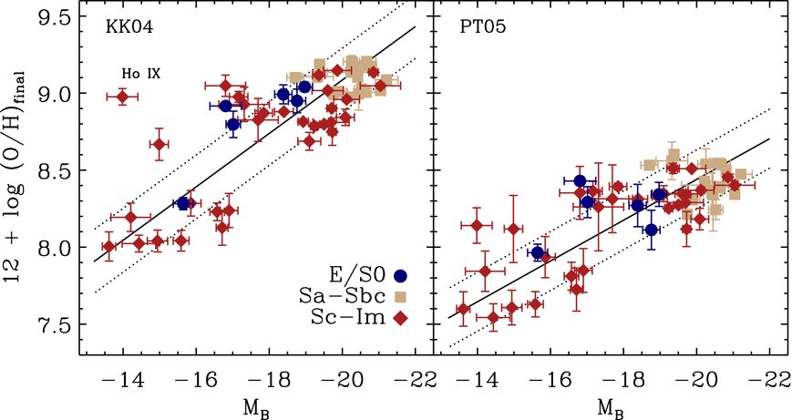 Figure 11. B-band luminosity–metallicity relation using the final characteristic (left) KK04 and (right) PT05 oxygen abundances of the SINGS galaxies (see Table 9). The symbols correspond to broad bins of morphological type: E-Sa (dark blue points), Sab-Sbc (tan squares), and Sc-Im (dark red diamonds). The solid lines indicate the linear ordinary least-squares bisector fits to each luminosity–metallicity relation, and the dotted lines correspond to the 1σ scatter around the best fit, ±0.2 dex. In the left panel, we label Ho IX, a tidal-dwarf galaxy in the M 81 group that is considerably more metal rich than comparably luminous galaxies (Croxall et al. 2009).