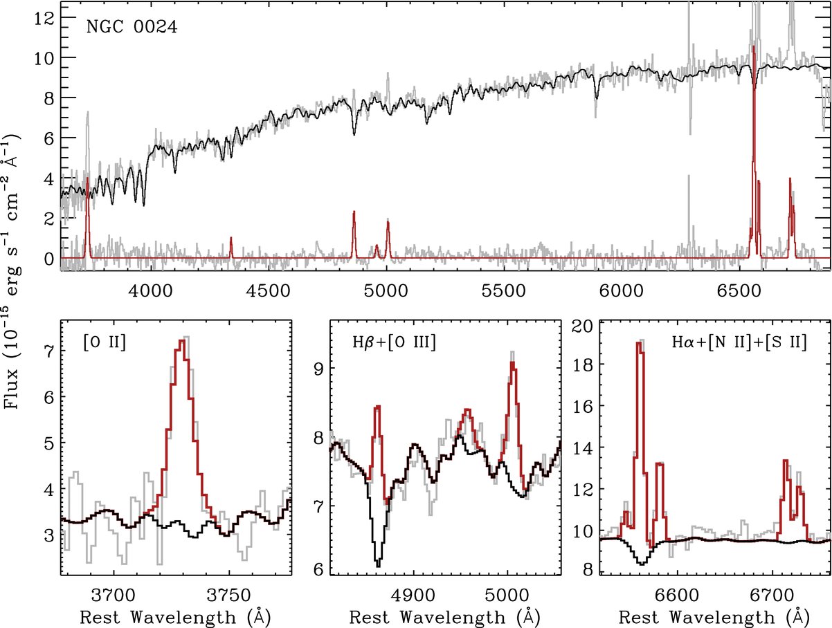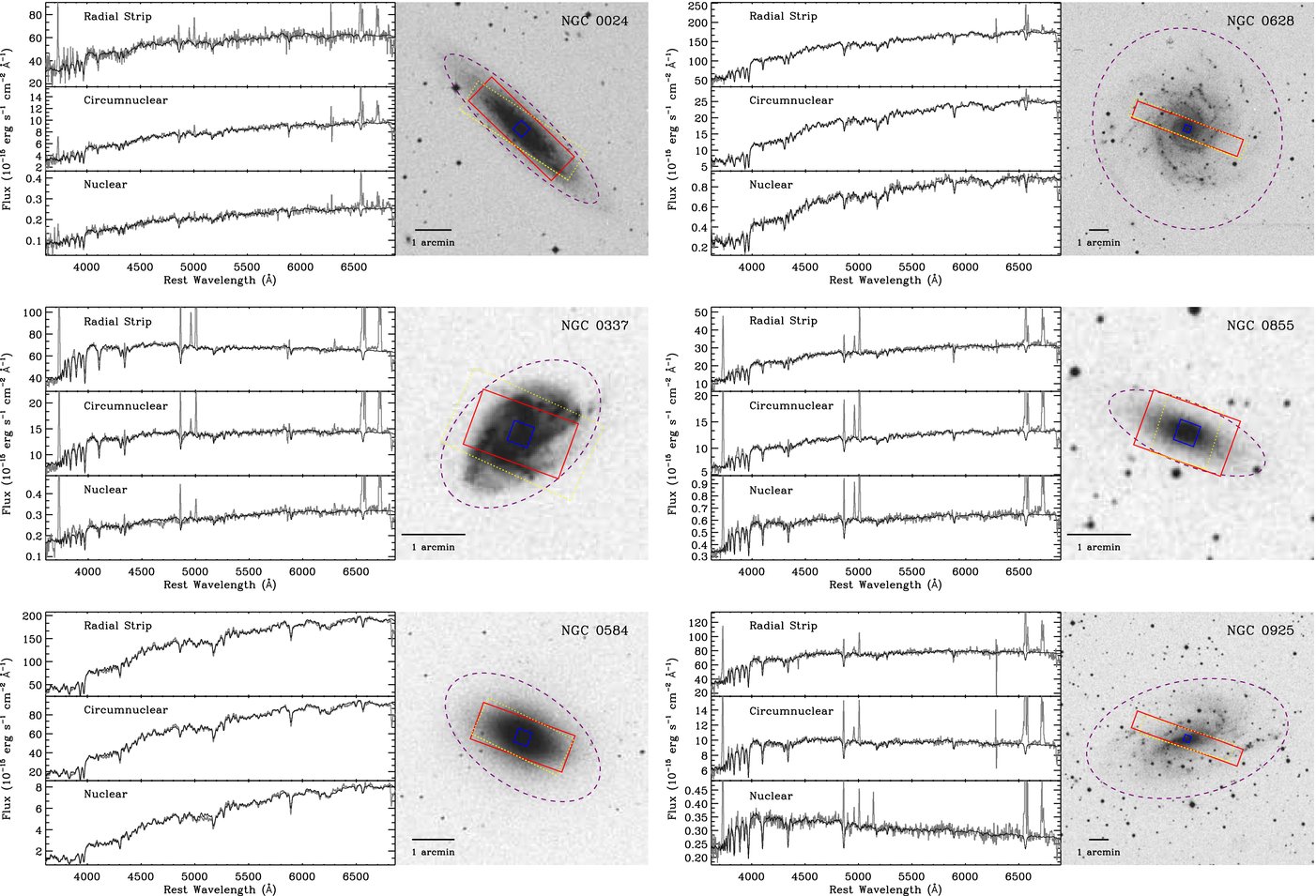 The SINGS galaxies were selected to span a broad range of morphological types, optical luminosities, and infrared properties, and this diversity is clearly reflected in their optical spectra. Figure A1 presents the reduced one-dimensional spectra24 in erg s−1 cm−2 Å−1 versus rest-frame wavelength in Å. We plot the data in gray and overplot the best-fitting stellar continuum model (see Section 2.2.2) in black. For each galaxy, we also show an optical Digitized Sky Survey image to illustrate how our spectroscopic apertures compare to the optical extent of the galaxy (dashed purple ellipse; see Table 1). The size of the spectroscopic apertures corresponding to our radial-strip and circumnuclear spectra is shown as a red rectangle and blue square, respectively. The dotted yellow rectangle shows the spatial coverage of the corresponding Spitzer/IRS long-low spectrum obtained as part of SINGS where there was at least double coverage in both spectral orders (Smith et al. 2004, 2007). In some cases there is a mismatch between the orientation angle of the IRS and optical radial-strip spectra. This difference occurs because many of the optical spectra were obtained before the IRS spectra had been observed, or even scheduled. For these objects when we were planning the optical observations we made the best effort to select a position angle for the optical spectrum based on the predicted/constrained position angle of the IRS observations.