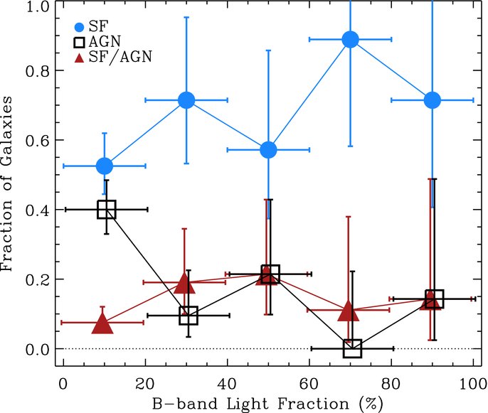 - 1.We find that the proportion of galaxies classified as SF and AGN is a strong function of the fraction of the integrated B-band light enclosed by the spectroscopic aperture. The fraction of the sample classified as AGN decreases from ≈40% to ≲15% as the B-band light fraction increases from ∼10% to ≳60%, with a corresponding increase in the fraction of galaxies classified as SF. The ∼15% incidence rate of objects classified as SF/AGN, on the other hand, is roughly independent of enclosed light fraction.