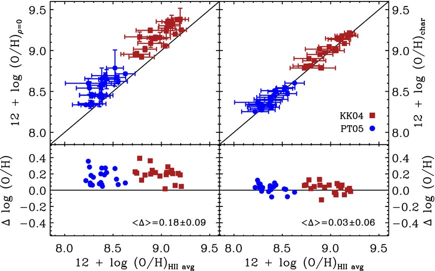 Peimbert (1967) was the first to point out that temperature inhomogeneities in H ii regions could cause the electron temperature inferred from the collisionally excited forbidden lines to be overestimated, and therefore the abundance to be underestimated (Stasińska 2005; Bresolin 2006). He defined a quantity, t2, equal to the root-mean-square deviation of the temperature from the mean value. Temperature inhomogeneities are expected to be more severe in metal-rich H ii regions because the higher efficiency of metal-line cooling leads to strong temperature gradients as a function of distance from the ionizing star or star cluster (Garnett 1992; Stasińska 2002, 2005). Typically, direct abundances, and the empirical methods that are calibrated against them, assume t2 = 0. Unfortunately, deriving t2 is very challenging observationally; it has been measured in a relatively small number of metal-rich