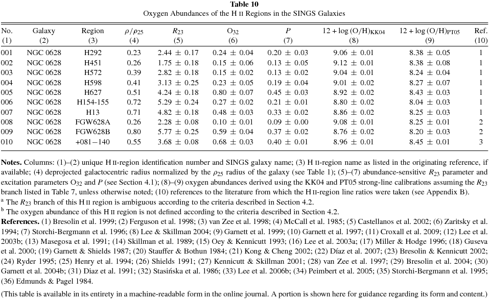 Notes. Columns: (1)–(2) unique H ii-region identification number and SINGS galaxy name; (3) H ii-region name as listed in the originating reference, if available; (4) deprojected galactocentric radius normalized by the ρ25 radius of the galaxy (see Table 1); (5)–(7) abundance-sensitive R23 parameter and excitation parameters O32 and P (see Section 4.1); (8)–(9) oxygen abundances derived using the KK04 and PT05 strong-line calibrations assuming the R23 branch listed in Table 7, unless otherwise noted; (10) references to the literature from which the H ii-region line ratios were taken (see Appendix B). aThe R23 branch of this H ii region is ambiguous according to the criteria described in Section 4.2. bThe oxygen abundance of this H ii region is not defined according to the criteria described in Section 4.2. References. (1) Bresolin et al. 1999; (2) Ferguson et al. 1998; (3) van Zee et al. 1998; (4) McCall et al. 1985; (5) Castellanos et al. 2002; (6) Zaritsky et al. 1994; (7) Storchi-Bergmann et al. 1996; (8) Lee & Skillman 2004; (9) Garnett et al. 1999; (10) Garnett et al. 1997; (11) Croxall et al. 2009; (12) Lee et al. 2003b; (13) Masegosa et al. 1991; (14) Skillman et al. 1989; (15) Oey & Kennicutt 1993; (16) Lee et al. 2003a; (17) Miller & Hodge 1996; (18) Guseva et al. 2000; (19) Garnett & Shields 1987; (20) Stauffer & Bothun 1984; (21) Kong & Cheng 2002; (22) Díaz et al. 2007; (23) Bresolin & Kennicutt 2002; (24) Ryder 1995; (25) Henry et al. 1994; (26) Shields 1991; (27) Kennicutt & Skillman 2001; (28) van Zee et al. 1997; (29) Bresolin et al. 2004; (30) Garnett et al. 2004b; (31) Diaz et al. 1991; (32) Stasińska et al. 1986; (33) Lee et al. 2006b; (34) Peimbert et al. 2005; (35) Storchi-Bergmann et al. 1995; (36) Edmunds & Pagel 1984.