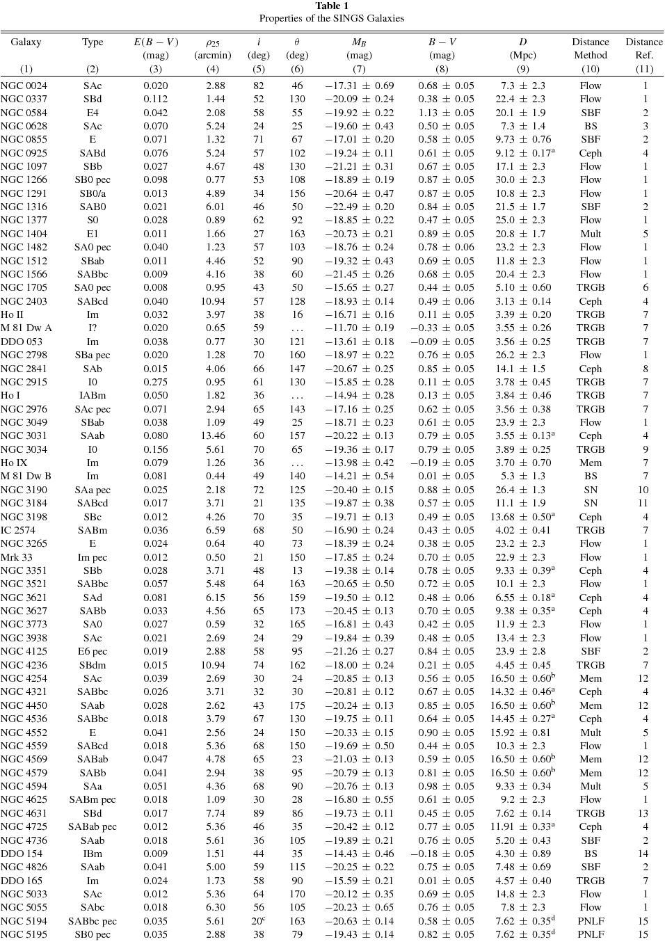 mag arcsec−2 (Jarrett et al. 2003); (7)–(8) absolute B-band magnitude and B − V color, both relative to Vega (Dale et al. 2007; Muñoz-Mateos et al. 2009a) (see Section 2.1 for more details); (9)–(11) distance, distance method, and corresponding reference to the literature. The distance methods have the following meaning: Flow, Hubble distance assuming H0 = 70 kms−1 Mpc−1 corrected for peculiar motions; SBF, surface-brightness fluctuations; BS, bright stars (supergiants); Ceph, Cepheid variables; Mult, an average of multiple, cross-calibrated techniques; TRGB, tip of the red-giant branch; Mem, group/cluster membership; SN, supernova; PNLF, planetary nebula luminosity function.