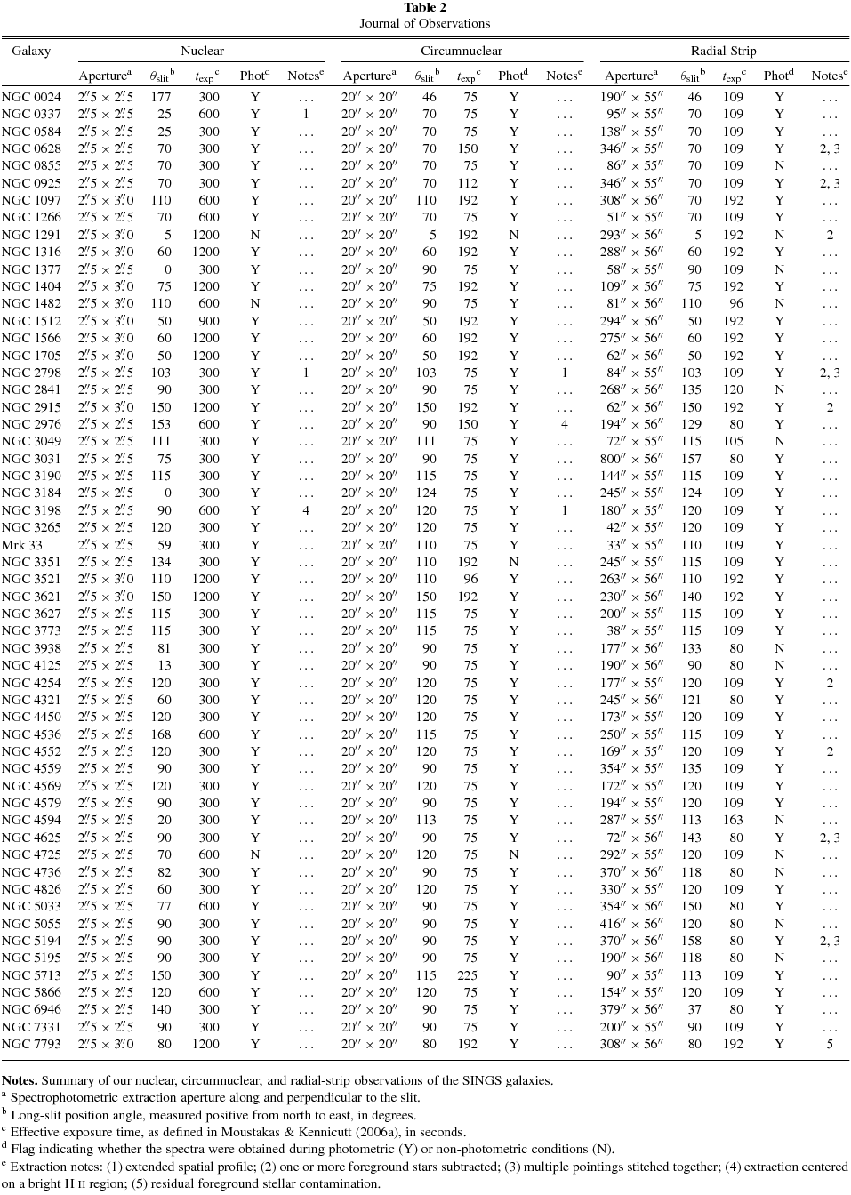 We performed a search of the literature to find published observations of H ii regions in the SINGS sample, resulting in data on 561 star-forming regions in ∼50% of the sample (38/75 galaxies) drawn from 36 distinct papers published between 1984 and 2009. In order to be included in our catalog, the [O ii] λ3727, Hβ, and [O iii] λ5007 line strengths must have been measured to enable an estimate of the gas-phase abundance (see Section 4.3). While this catalog is not exhaustive, it does include all the major spectroscopic surveys of H ii regions in nearby galaxies conducted to date (e.g., McCall et al. 1985; Zaritsky et al. 1994; van Zee et al. 1998). In general, we gave preference to the most recent observations over older data obtained using nonlinear detectors, which may be biased (Torres-Peimbert et al. 1989). We also only tabulated data based on traditional spectrophotometry, not narrowband imaging (e.g., Belley & Roy 1992; Dutil & Roy 1999), which may suffer from a variety of systematic errors (Dutil & Roy 2001). Finally, observations of the same H ii region by different authors were retained as independent observations.