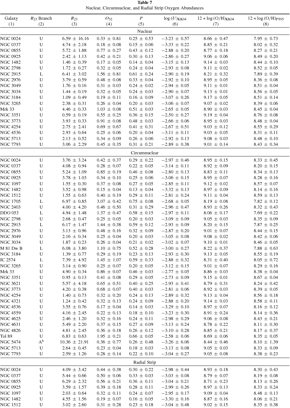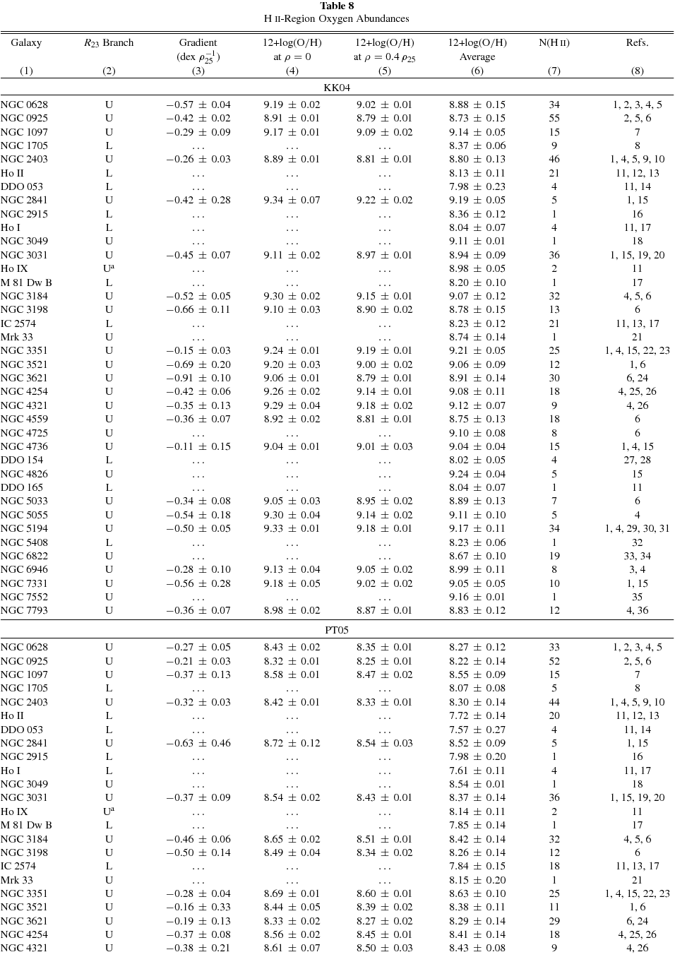 | No. | Galaxy | Region | ρ/ρ25 | R23 | O32 | P | 12 + log (O/H)KK04 | 12 + log (O/H)PT05 | Ref. |
