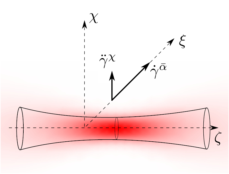 on the ζ-axis. The mirrors at the emission and absorption are curved such that the phase along them is constant. The phase of the Gaussian beam (without the term including the time) is given by