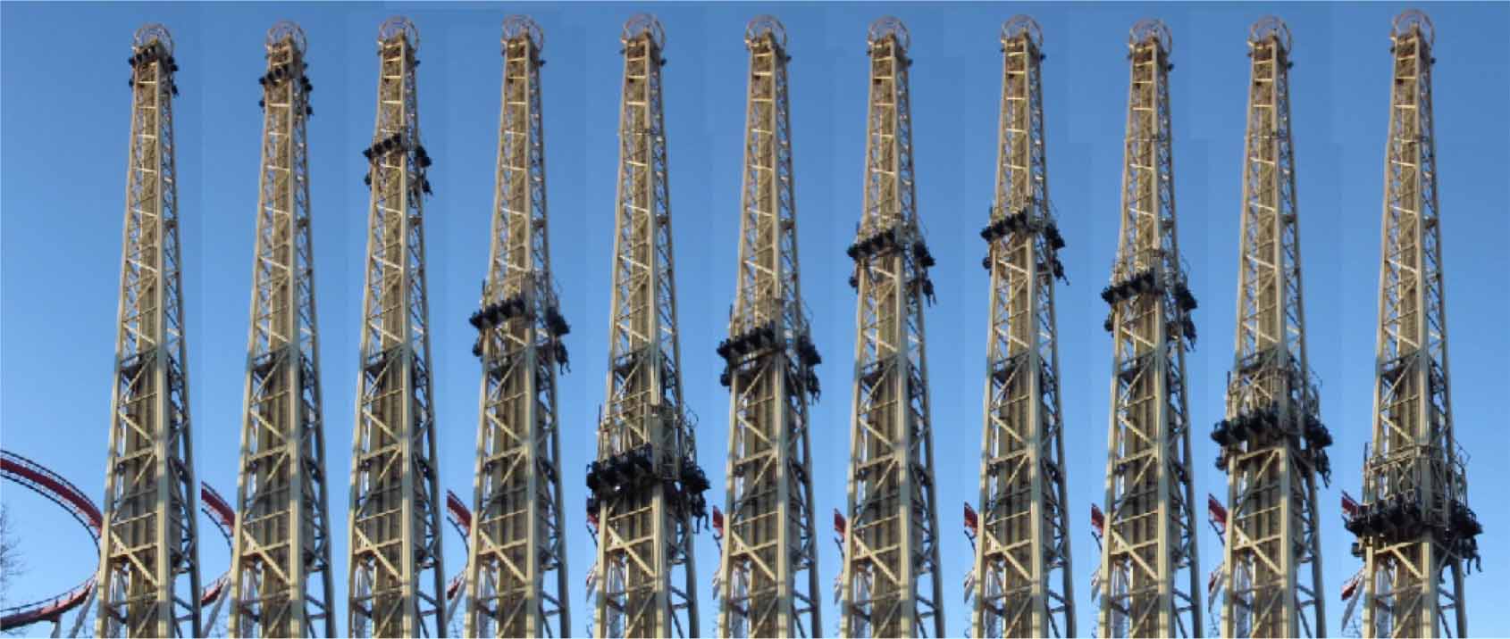 Standard image High-resolution imageFigure 1. Sequence of screen shots of a Turbo Drop tower, the Gyldne Tårn (Golden Tower), at Tivoli Gardens in Copenhagen. The interval between the screenshots is 1.0 s and the distance between horizontal beams is approximately 2.4 m.