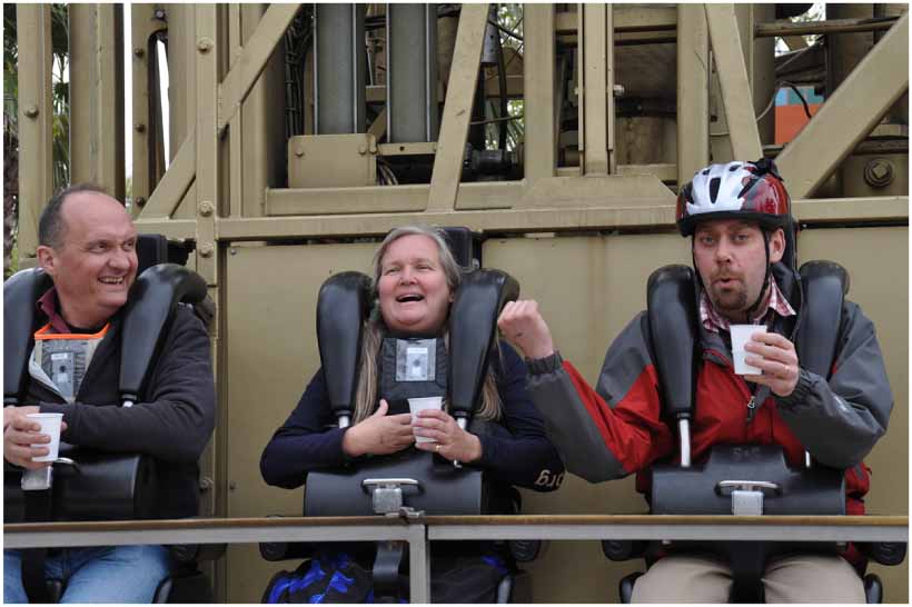 The acceleration graph in figure 2 shows that the ride accelerates downward faster than the acceleration of gravity. For downward accelerations larger than g the force from the ride must come from above, pressing the rider downward. This physical memory of a downward acceleration exceeding g may on special occasions be enhanced by bringing a little soft plastic glass with a small amount of water and see the water flying out at the top, as if the force of gravity were temporarily inverted.