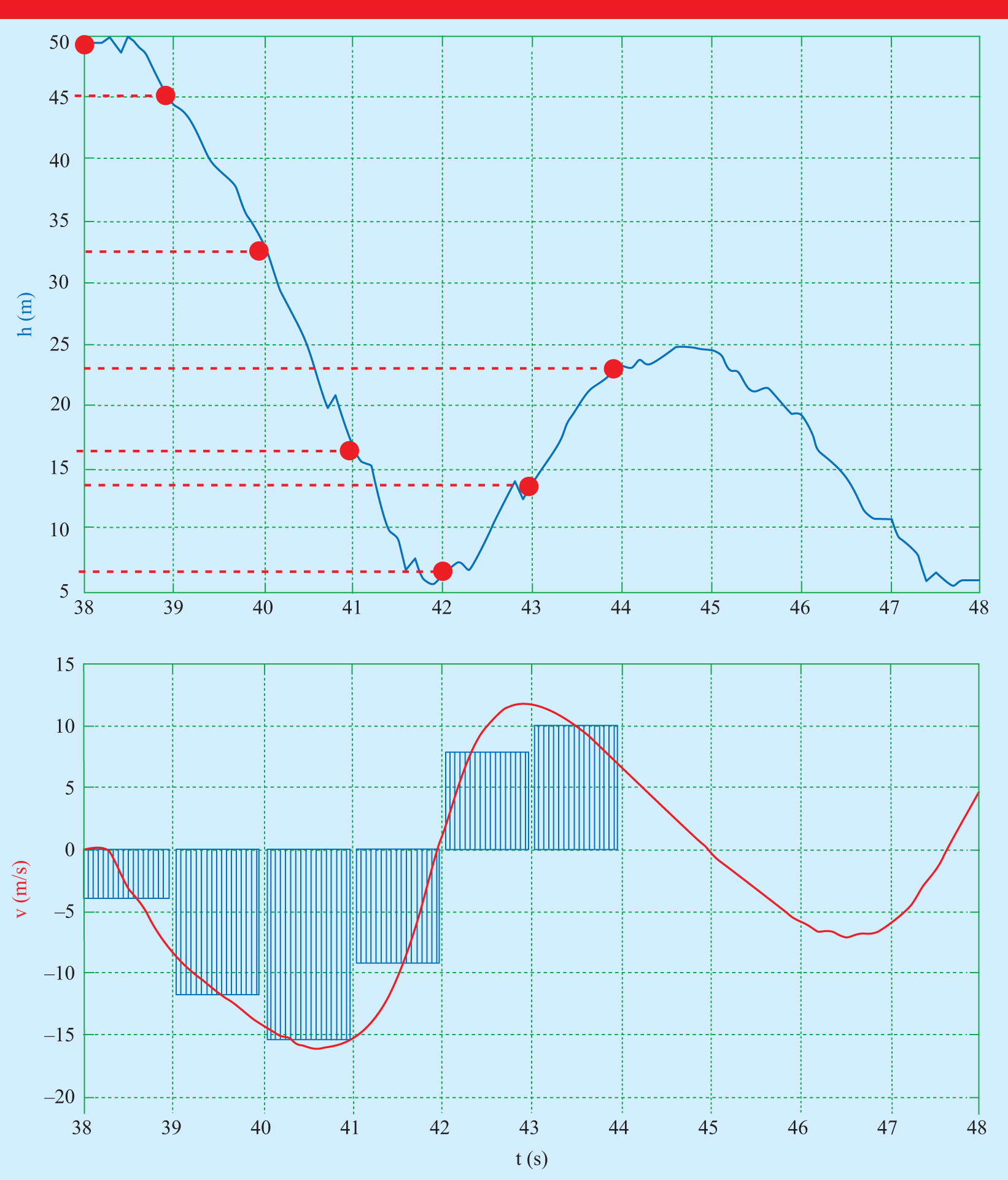 Figure 4. Illustration of the relation (1) between the velocity and the change in elevation as v ≈ Δh/Δt and Δh ≈ vΔt for a part of the data shown in figure 2 of the Turbo Drop (figure 1). The numerical elevation data were obtained from the pressure sensor and the velocity by integration of the vertical acceleration data from a WDSS sensor.