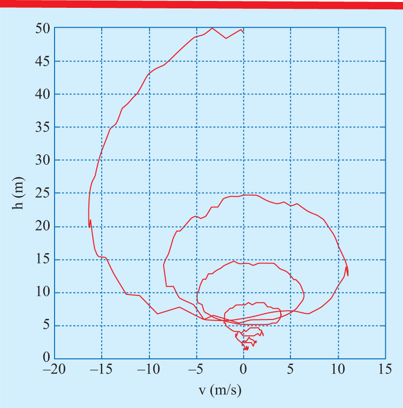 In the Space shot and Turbo Drop rides the fall of the gondola is stopped by compressed air, giving the riders a few extra bounces after the first drop, as seen in figure 1. Every bounce brings the gondola further down until it reaches the loading and unloading height. The phase portrait in figure 5 shows elevation versus velocity. If the bounces had been without energy losses, the phase portrait would simply have been an ellipse. The damping results in the size of the ellipse getting smaller and smaller. In addition, the lowering of the gondola is reflected in the centre of the ellipse being lower for every bounce.