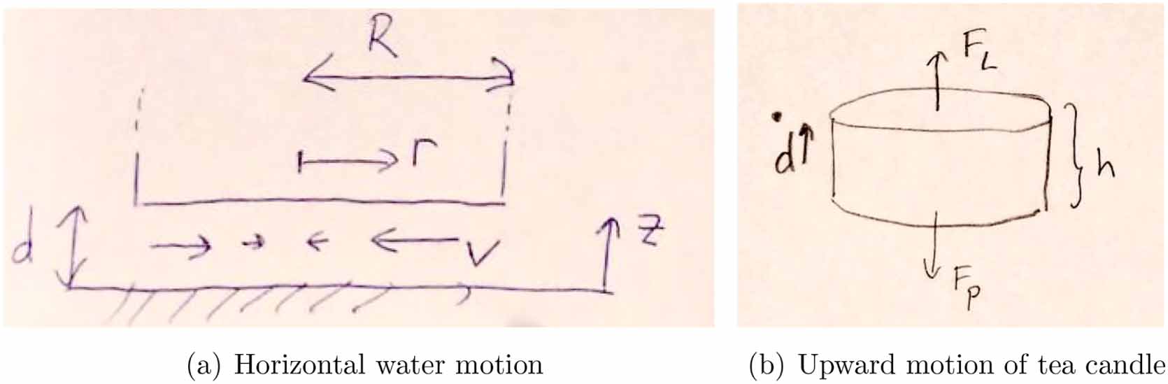 A simple estimate of the forces on the tea candle was derived under the assumption of viscous flow. In this way an approximate time dependence of the distance to the bottom of the container could be obtained, as shown in figure 4. Figure 5 illustrates the horizontal motion of water and the resulting forces on the tea candle as water seeps in. The mathematical model and calculations are presented in detail in section 4.