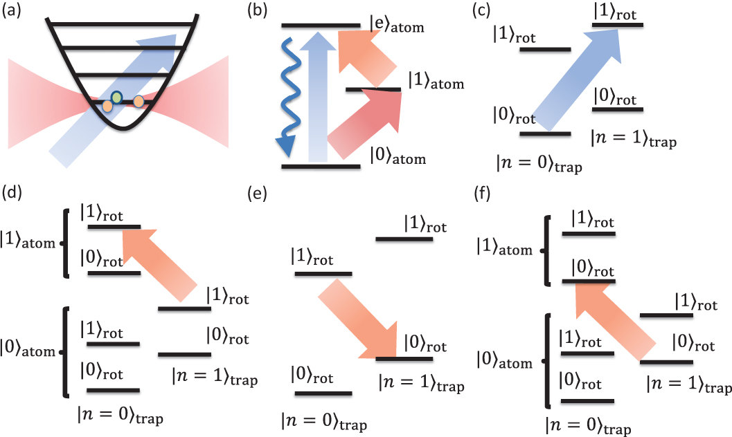 Detection of |1〉atom will then project the state to |0〉atom|1〉rot|0〉trap. Because this is a pure state, it can be brought down to the ground state by repeating the projection cooling between |1〉rot and |0〉rot. In the case |0〉atom is detected, the state returns to the same pure state |0〉atom|1〉rot|0〉trap again, and one can just repeat the cooling pulse sequence until the system is projected to the ground state (see figures 3(d)–(j)). Therefore, to cool the thermal state in (6), one can probe the rotational transition of |1〉rot → |0〉rot, |2〉rot → |1〉rot, etc, until the system is projected to a pure state |0〉atom|jrot|0〉trap, which can then be projected down to the ground state following the ladder downwards.