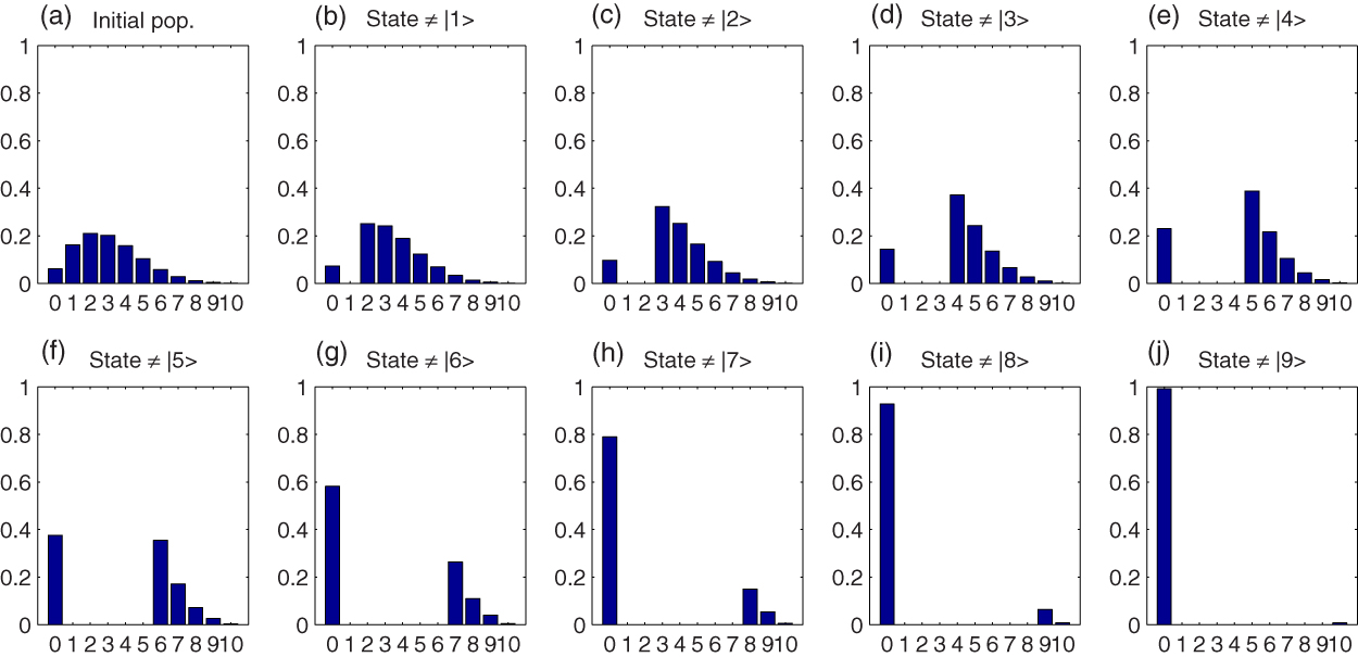 As an example, we consider again, the case of SrCl+ trapped at a cryogenic temperature of T = 5 K. Figure 3 shows the evolution of the molecular rotational state after measuring |0〉atom, projecting the system onto a new mixed state. We note that due to renormalization of the wave function after each state detection, the total failure rate is determined by the population ratio between the ground and the highest microwave-addressed state, which in this case is p0(J > 9)/[p0(J > 9) + p0(0)] = 0.03. The highest required microwave frequency, i.e. for addressing the |9〉rot → |8〉rot is 117 GHz, which can be achieved using a commercial tunable microwave source, e.g. Agilent E8257D PSG, and a frequency doubler.