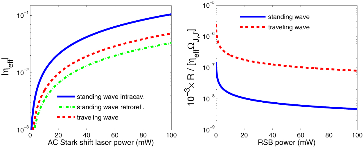 Figure 4. (a) Effective LDP produced by spatially varying laser field for three different scenarios, all at wavelength λ = 1 μm. Red: focused laser beam, w0 = 2 μm. Green: retro-reflected laser beam, w0 = 20 μm. Blue: cavity laser beam, w0 = 100 μm, cavity finesse, F = 1000. (b) Estimate of spontaneous-Raman-rate-to-Rabi-frequency ratio. Raman scattering rate is estimated using 10−3 × Rayleigh rate, for traveling and standing waves, both at wavelength λ = 1 μm.
