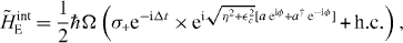 It is useful to transform $\tilde {H}_{\mathrm {E}}$ into the interaction picture with respect to $\tilde {H}$ , i.e. performing the transformation $\tilde {H}_{\mathrm {E}}^{\mathrm {int}} = {\mathrm { e}}^{{\mathrm { i}}\tilde {H} t/\hbar }\tilde {H}_{\mathrm {E}}\,\mathrm {e}^{-\mathrm {i}\tilde {H} t/\hbar }$ , where $\tilde {H} = \frac {1}{2}\hbar \omega _0\sigma _z + \hbar \omega _{\mathrm {t}} a^\dagger a$ as found above. Invoking the rotating wave approximation, omitting terms oscillating at 2ω0, the final result for the interaction Hamiltonian reads