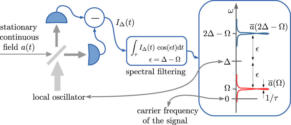 In reality one has access only to a finite time interval (and correspondingly to a finite band of frequencies) of the total field a(t). These detectable intervals of the total field correspond to specific temporal modes. They can be physically defined, for example, by the temporal profile of the pumping field in pulsed experiments [8, 10, 52–54], they can also be extracted by post-processing the previously recorded time signal [55, 56], or they can be selected by the measurement apparatus as a result of the corresponding response and detection times [56–59]. In particular, in the case of experiments involving stationary fields, the detection time can be sufficiently long to select a well-defined spectral component of the total signal (as achieved, for example, with an electronic spectrum analyzer) [6, 7, 42].