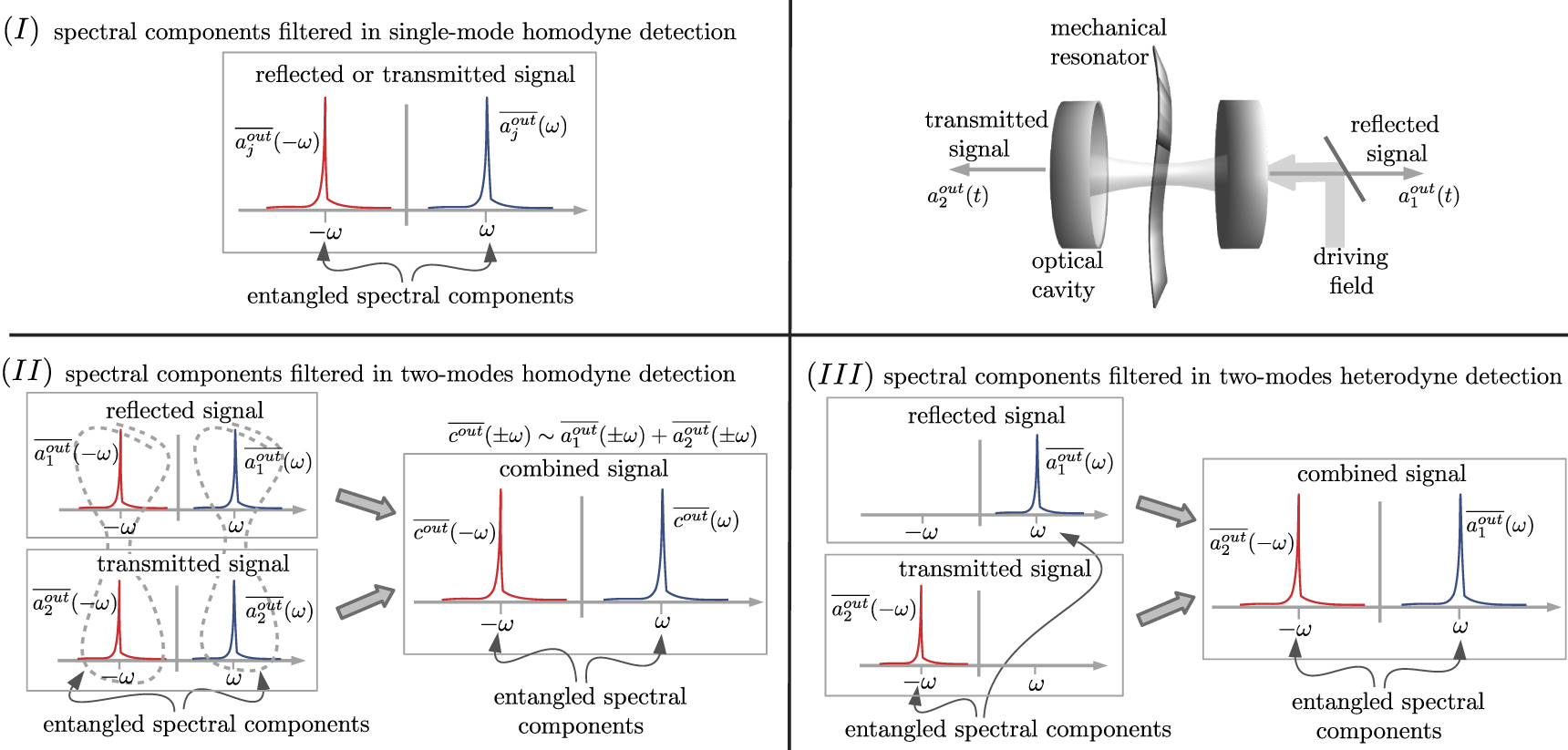 Finally, we apply these ideas to the analysis of ponderomotive squeezing [43–46], namely the squeezing that is obtained as a result of the optomechanical interaction between a mechanical resonator and the light in an optical cavity. Optomechanics provides a novel approach to the area of quantum non-linear optics, which recently has attracted much attention for its potential applications in quantum-enhanced technologies [47, 48]. In this work, we investigate a two-sided cavity with a membrane in the middle, and we identify the spectral components of the output fields that exhibit larger entanglement and that are experimentally accessible with homodyne and heterodyne techniques.