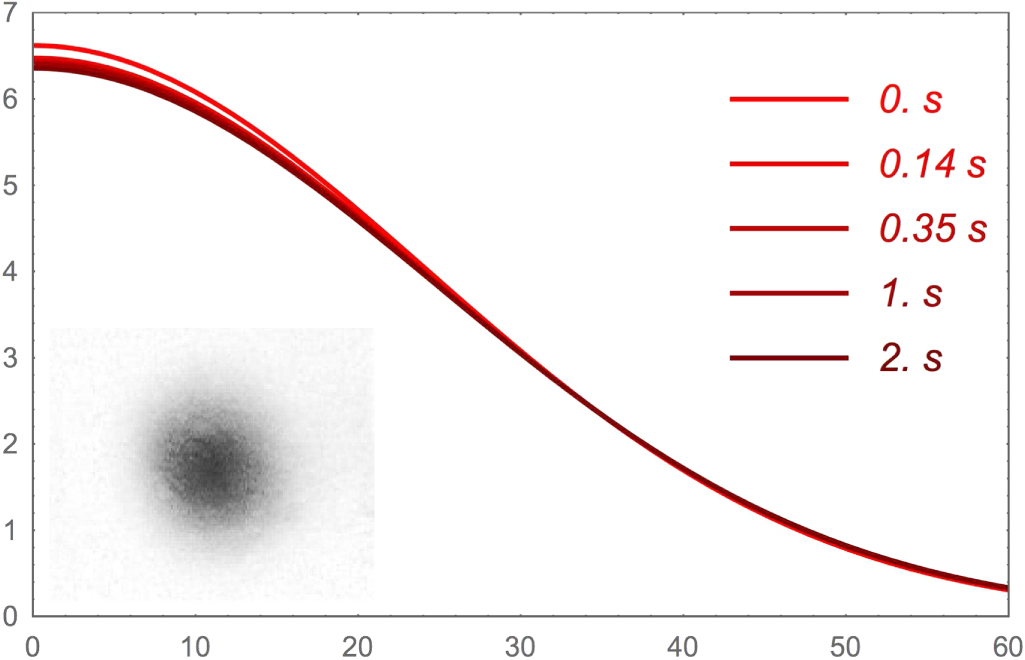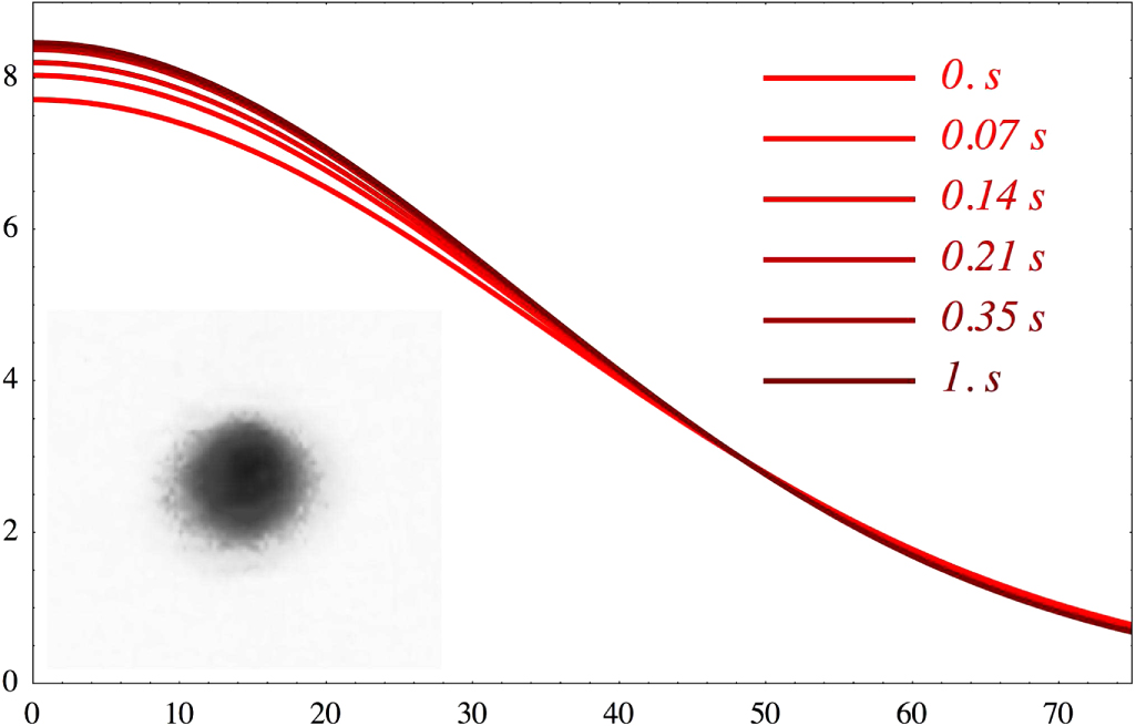 Figure 4. Measured beam profile. The figure shows the profiles of the reflected beam recorded at different times. We used water illuminated with an unfocused incident beam of 2 W power. The inset shows the raw data for t = 0 s; the curves present fits with Gaussians normalised to the total number of pixels. One sees that the beam size decreases until a typical time of 1 s; after this time the spot size is stationary.