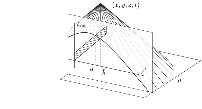 in the x-z-plane. The acceleration (34) points towards the pulse and is proportional the inverse distance to the pulse like we would expect from 2D Newtonian gravity. Like in Newtonian gravity, the gravitational effect would be interpreted as instantaneous if the pulse and not the spacetime events representing the emission would be seen as the source of the gravitational field since all points of a given x-y-plane seem to be effected simultaneously by the pulse when the x-y-plane passes region II.