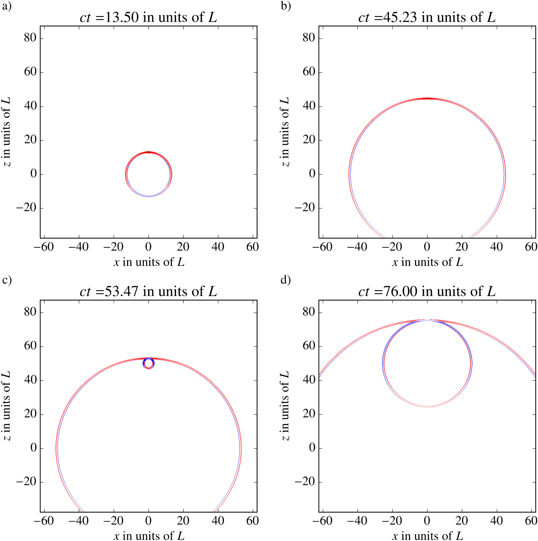 Standard image High-resolution imageIn figure 5, hp is plotted in the x-z-plane for different times after the events of the emission of the pulse. The corresponding spatial sections of the regions