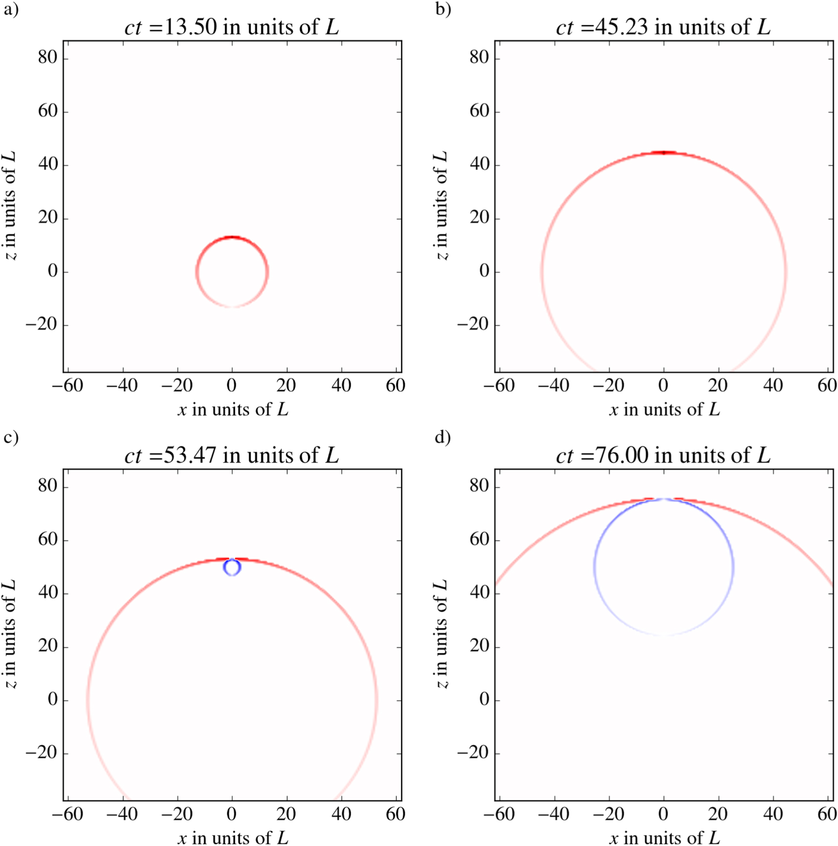 in the (x, y)-plane for different times t. hp is normalized to units of κ and then the logarithm of the logarithm is taken. In (a), we see the effect of the pulse on the metric expanding from the point of the emission of the pulse at z = 0. In (b), the field has already expanded. In (c), the pulse has been annihilated at x = D and the sphere expands that contains the information about the absorption. In (d), this sphere has further expanded and both fronts approach the form of a plane fronted wave.